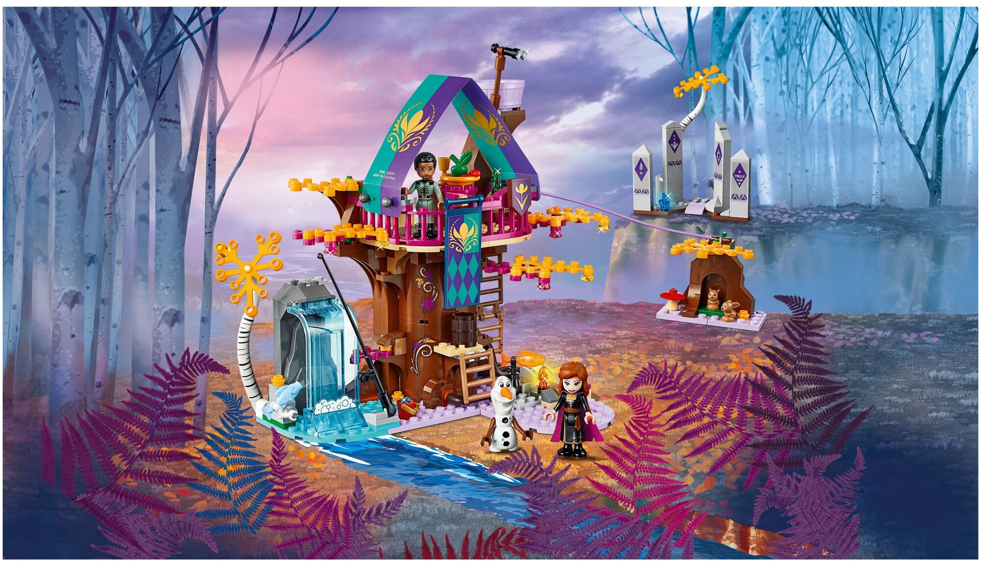 Собери этот удивительный домик на дереве из мультфильма «Холодное сердце — 2» студии Disney и отправляйся на поиски приключений в волшебный лес вместе со своими любимыми персонажами Disney! Поднимись на смотровую площадку вместе с Маттиасом, пока Анна и Олаф исследуют лес. Соскользни вниз по канату и попробуй поймать рыбу, чтобы приготовить её на костре и поужинать в уютной столовой наверху. Исследуй домик на дереве LEGO® и найди сундук с сокровищами, а затем выйди на улицу, чтобы познакомиться с кроликами, живущими в своём лесном доме. Что это за странные камни, которые лежат повсюду в волшебном лесу? Они хранят ключи от древней магии, которая снова пробудилась.