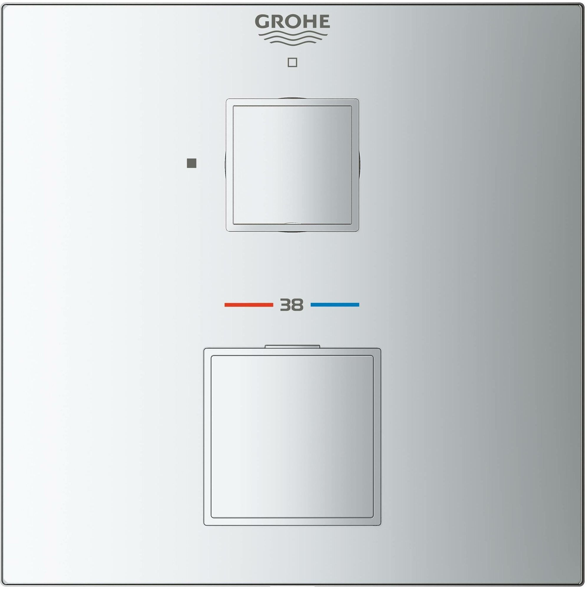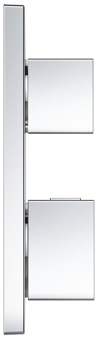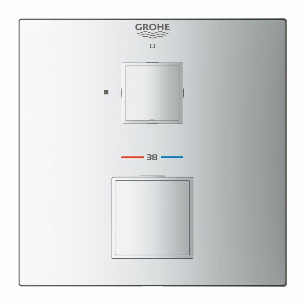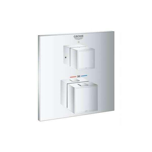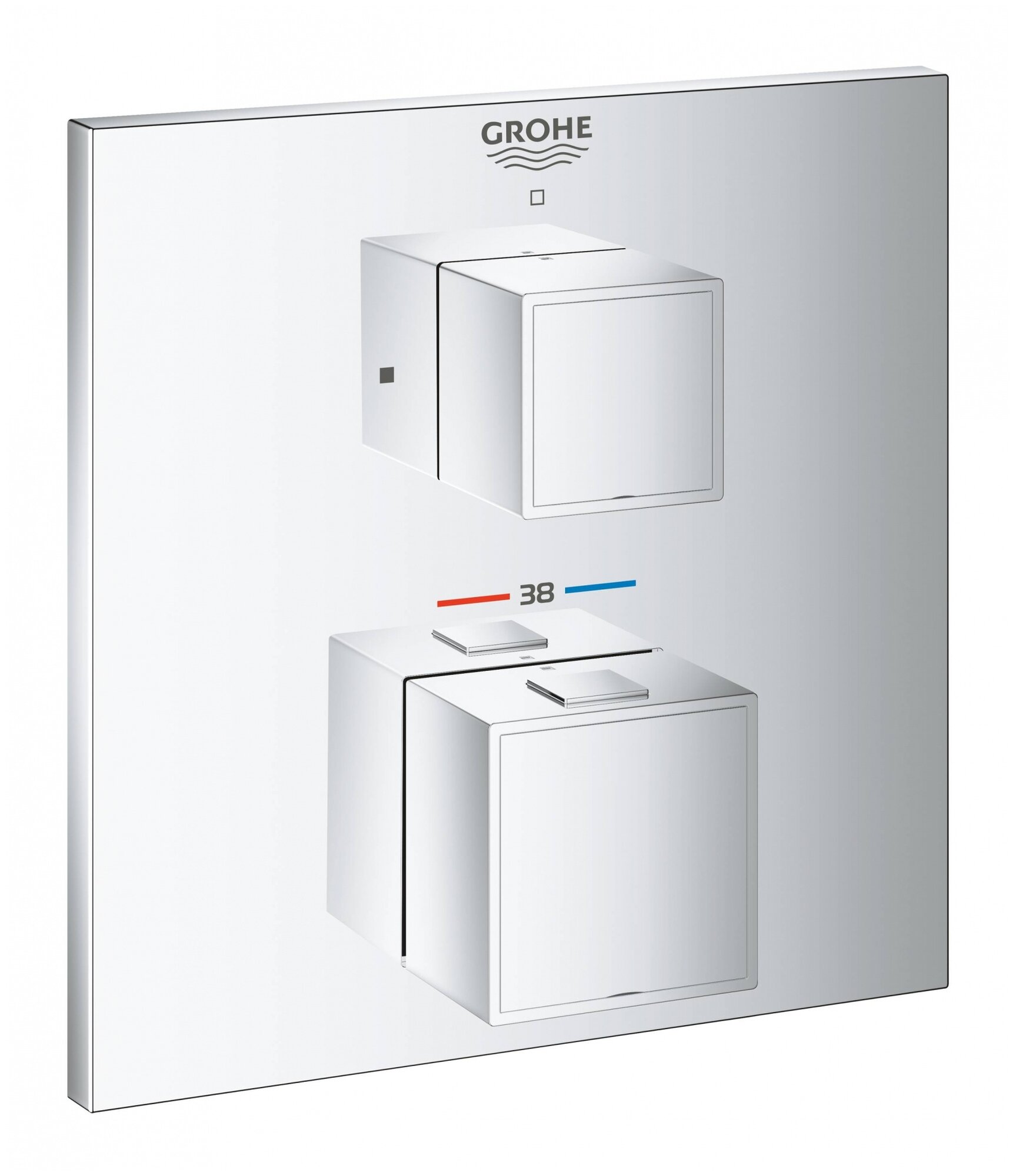 Внешняя часть термостататического смесителя для душа GROHE Grohtherm Cube, хром. Термостат GROHE Atrio - инновационное решение для душа. GROHE TurboStat встроенный термоэлемент. GROHE StarLight хромированная поверхность с настенными розетками. GROHE QuickFix (скрытые эксцентрики, уплотнение, скрытый монтаж). Металлическая накладная панель, регулируемая на 6. GROHE SafeStop стопор безопасности при 38C GROHE SafeStop Plus опционно ограничитель температуры на 43C / 46C, включен встроенные обратные клапаны и грязеулавливающие фильтры. Металлические рукоятки распределение расхода: выход B = 27 л/мин, выход C = 30 л/мин. Без встроенного механизма