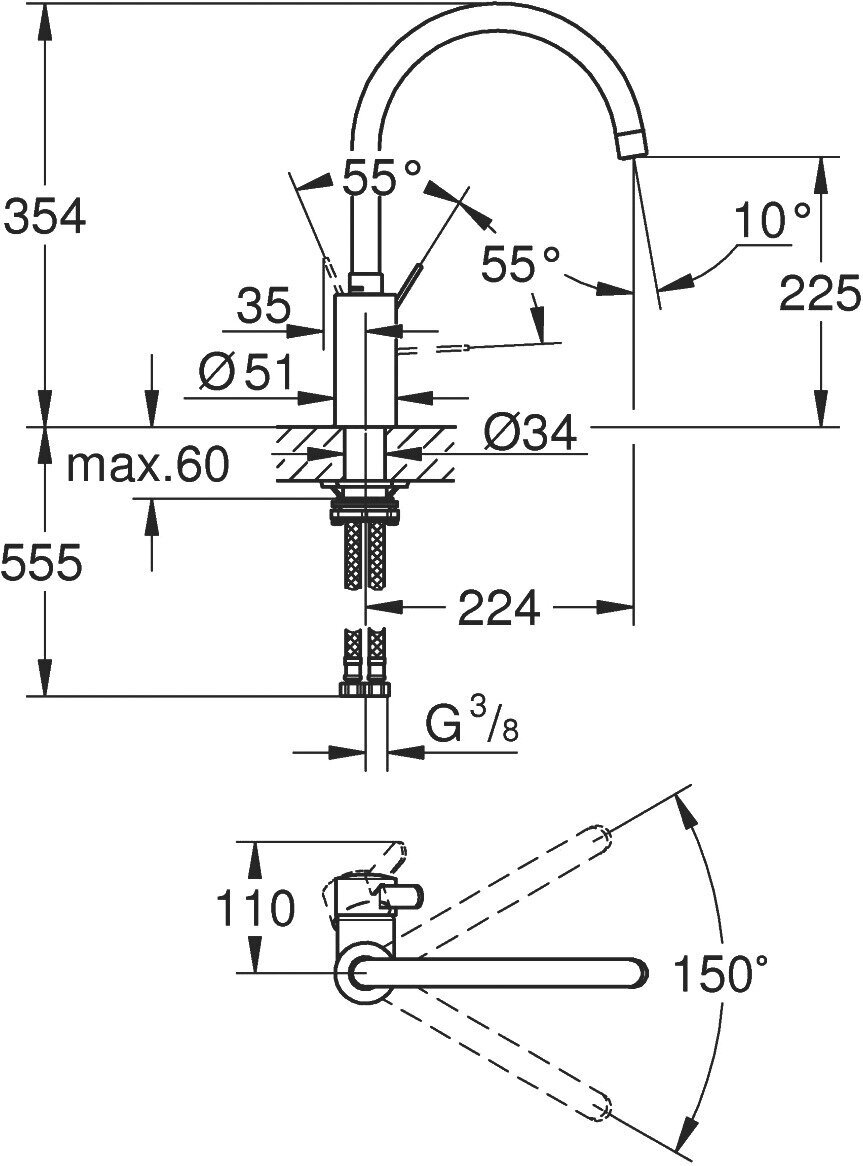 Смеситель однорычажный для мойки, DN 15, суперсталь. Высокий излив, монтаж на одно отверстие, GROHE StarLight поверхность, GROHE SilkMove керамический картридж 35 мм, GROHE Zero Раздельные пути подачи воды - не содержит никеля и свинца, аэратор, регулировка расхода воды, поворотный трубкообразный излив, выбор радиуса поворота: 0 / 150, гибкая подводка, GROHE QuickFix быстрая монтажная система.