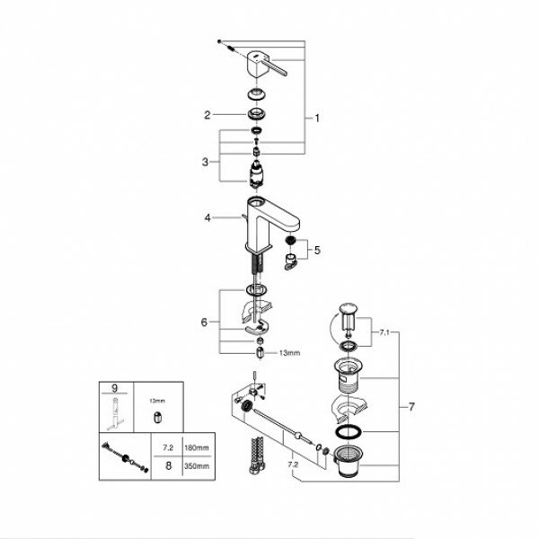 Однорычажный смеситель для раковины Grohe Plus с донным клапаном.