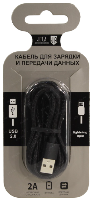 Прочие особенности и свойства | Дата-кабель Jet.A с пропускной способностью 2А позволяет быстро и эффективно зарядить устройства, оснащенные разъемом lightning 8 pin.,Кабель может использоваться для быстрой передачи данных на персональный компьютер или ноутбук.,Нейлоновая оплетка придает кабелю дополнительную жесткость и защищает от возникновения заломов и механических повреждений. |
