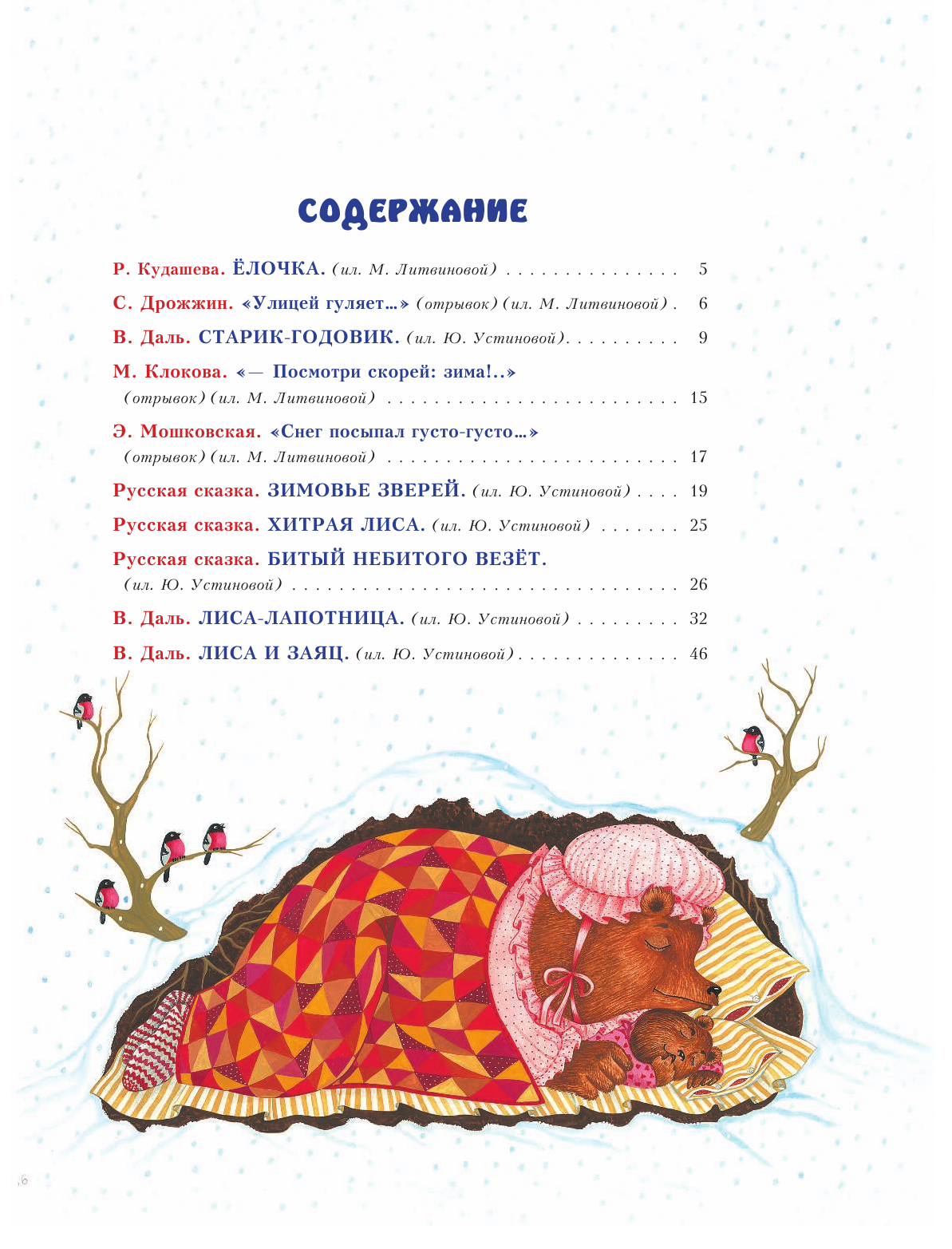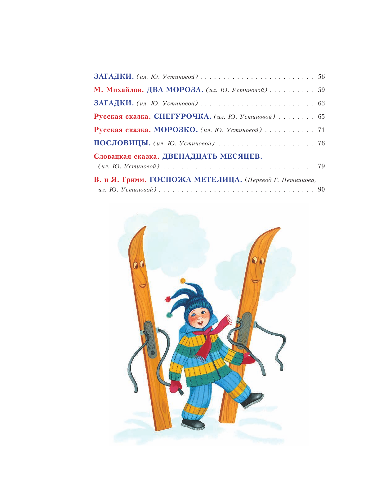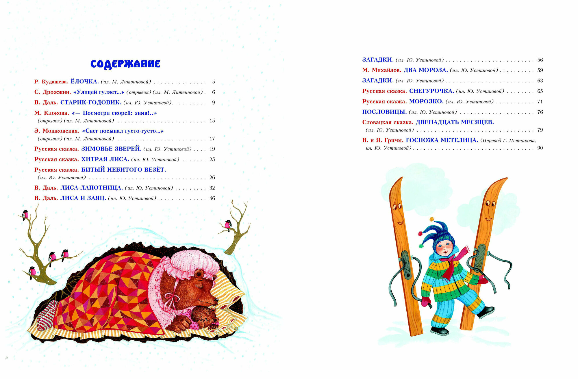 Тоненькая книга большого формата (меньше 100 страниц). Обложка красиво оформлена: украшена блёстками. Сзади на обложке тоже есть рисунок. Использованы иллюстрации двух художников. Мне понравились только рисунки художницы которая оформляла обложку: добрые, детские, их приятно рассматривать. Но это моё субъективное мнение. Содержание понравилось: есть стихи, загадки, пословицы, сказки. Всё с зимней тематикой.