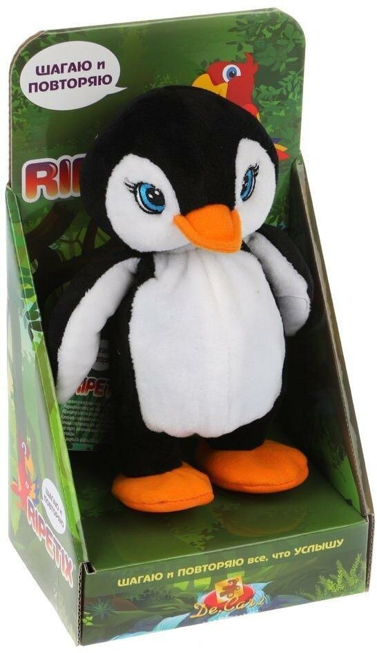 Интерактивная игрушка Пингвин от итальянского бренда De.Car2 Ripetix. Игрушка черно-белого цвета с синими глазами, большим оранжевым клювом и желтыми лапками.