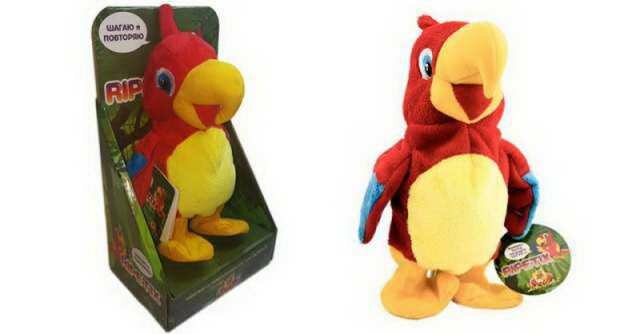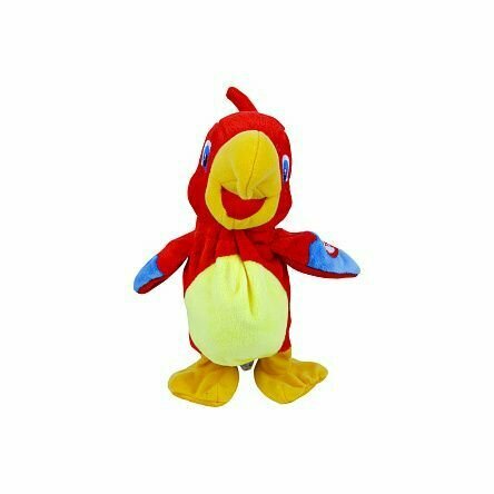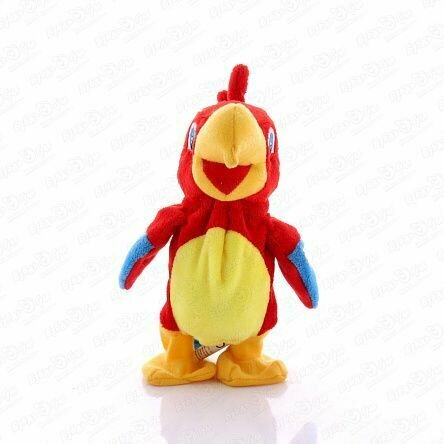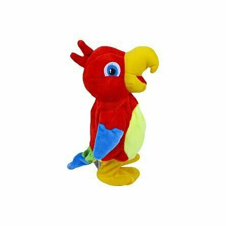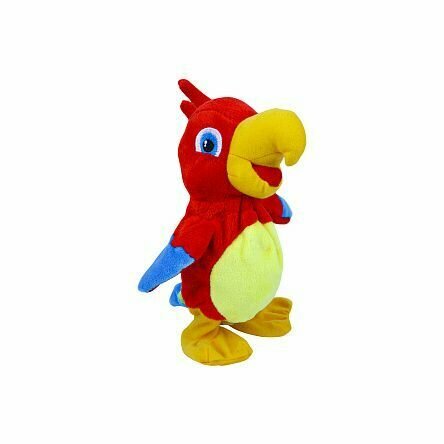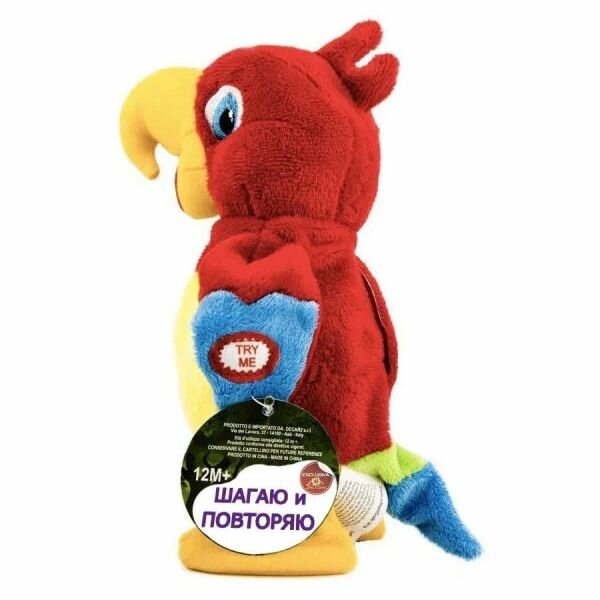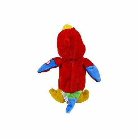 На спине игрушки под шерсткой встроен механизм, который записывает речь, а затем повторяет ее. При этом Попугай весело шагает. Для активации интерактивных функций необходимо включить кнопку на спине и нажать на крыло игрушки с пришитой эмблемой.< /p>