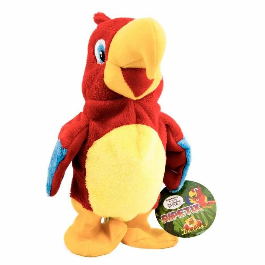 Интерактивная игрушка Попугай от итальянского бренда De.Car2 Ripetix. Игрушка красного цвета с большим оранжевым клювом, желтым животиком и синими вставками на крылышках.