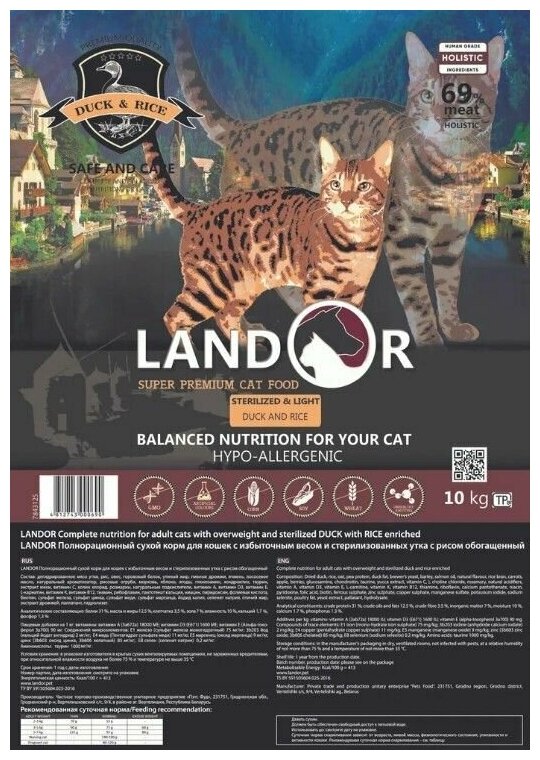Основная проблема организма стерилизованных домашних животных - это увеличение веса, и кошки не исключение. Корм LANDOR STERILIZED & LIGHT for a CAT разработан специально для стерилизованных кошек. Набор химических элементов, содержащихся в нем, идеально подойдет для пищеварительной системы домашних питомцев. Мясо утки, главный ингредиент которого по своему составу содержит оптимальное количество витаминов и белков, укрепит иммунитет, гарантирует набор всех необходимых химических веществ в рационе питания. Высокое содержание L-карнитина обеспечит стабильный процесс пищеварения, что не даст вашему любимцу набрать избыточный вес, одновременно стимулирует рост мышц и синтез белков в организме. Преимущества: 1-ый и основной ингредиент ; дегидрированное мясо утки. 69% мясных ингредиентов. Мономясные составы. Гипоаллергенный продукт. Не содержит пшеницу, кукурузу, сою, ГМО, искусственные красители, вредные химические добавки, искусственные антиоксиданты и консерванты. Не содержит курицу и куриный жир. Удобная упаковка со слайдером или зип-локом на всех фасовках.