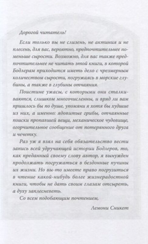 Четвертый и заключительный том истории о невероятных приключениях сирот Бодлеров оказался самым пухленьким, объемным, и это несказанно радует, ведь так не хочется расставаться с любимыми героями, хоть и интересно узнать, чем же закончится эта история, удастся ли юным Бодлерам спастись от преследующего их графа Олафа и его свиты и найти ответы на все свои вопросы.