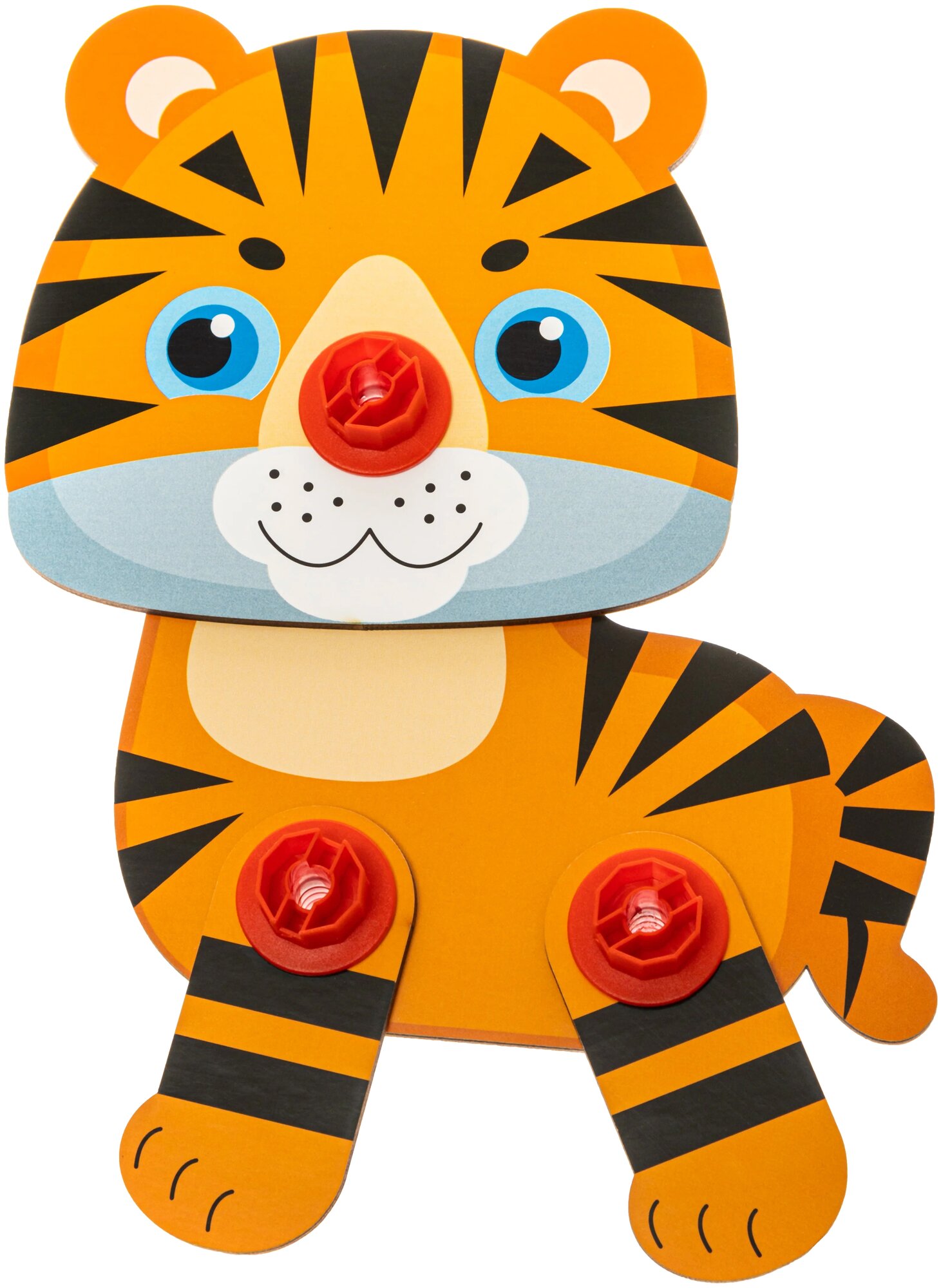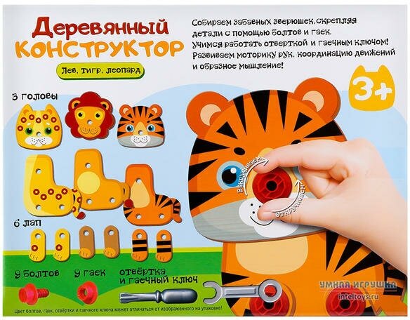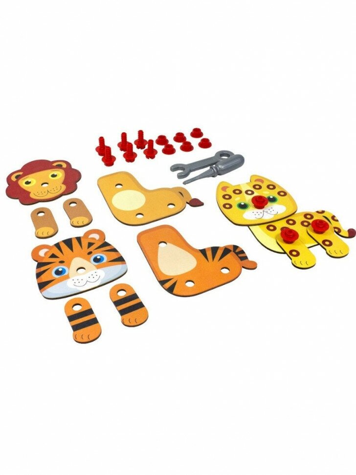 В комплекте детали для сборки 3х забавных животных: льва, тигра, леопарда, а также инструменты для скрепления деталей - болты, гайки, гаечный ключ, отвертка.