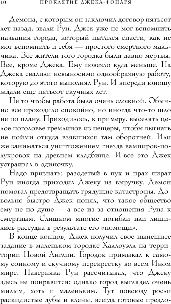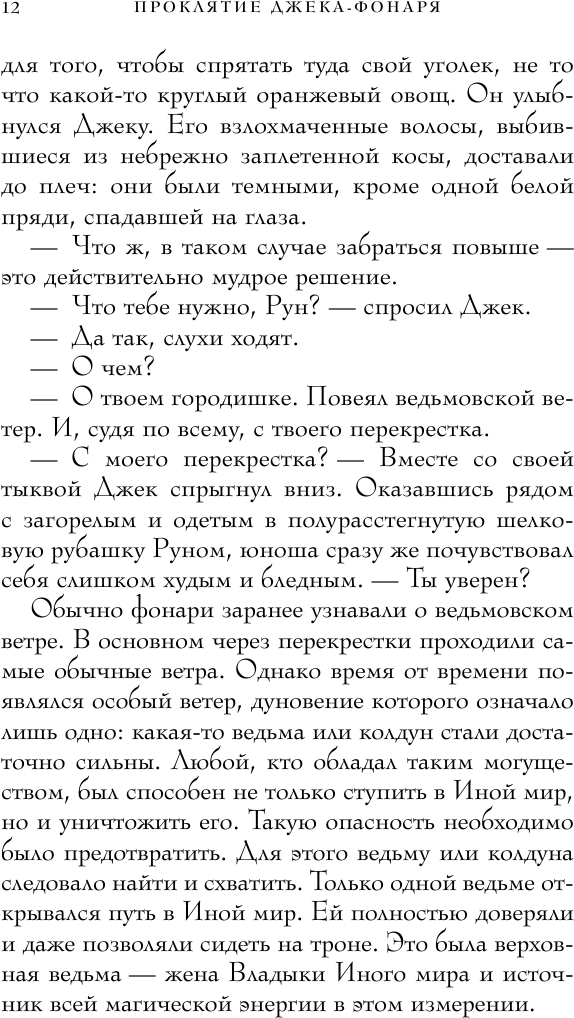 Думаю, стоит начать с оформления. Книга выполнена изумительно! Не перестаю крутить ее в руках. Естественно, подгадала ее чтение под HALLOWEEN. В общем, история мне понравилась, но есть некоторые моментики... Книга читается очень легко, это плюс. Самый проходящий возраст для чтения, на мой взгляд, лет 13 и чуть больше. Это неплохая история для детей подростков. Итак, перед нами два мира - мир смертных (живых людей) и Иной мир (там существует всякая нечисть: вампиры, оборотни, вурдалаки, ведьмы и т.д.) Главный герой Джек фонарь (мне очень понравился). Его задача находиться на границе миров и не допускать перемещения людей в Иной мир, а также жителей того мира в мир людей. Так же есть главная героиня Эмбер, она ведьма. И вот тянет ее в Иной мир, хоть ты тресни. Никакие доводы на неё не действуют. С этого и начинаются приключения... Ну вот она меня временами очень сильно раздражала своими поступками, мыслями. Ещё мне очень полюбилась тыква Джека, его спутница. В общем, здесь чего только нет: приключения, интриги, любовь (да не просто, а четырёхугольник любовный). На протяжении всей книги, прям казалось, что смотришь Диснеевский анимационный мультфильм. Если снимут, посмотрела бы с удовольствием, он прям напрашивается. В целом, хотелось бы более подробно узнать о каждом мире, о жизни главных героев и их прошлом. Мне не хватило детальности и продуманности. Было ощущение, что читаешь не отдельную книгу, а вырванный кусок из другого какого-то произведения. Несмотря на то, что здесь много всего присходит, столько всего смешано, казалось срисованным с других известных историй и фильмов. Но как итог - Если хочется простого чтения с легкой ноткой мрачности, приключений и любви, то эта книга подойдёт очень хорошо.