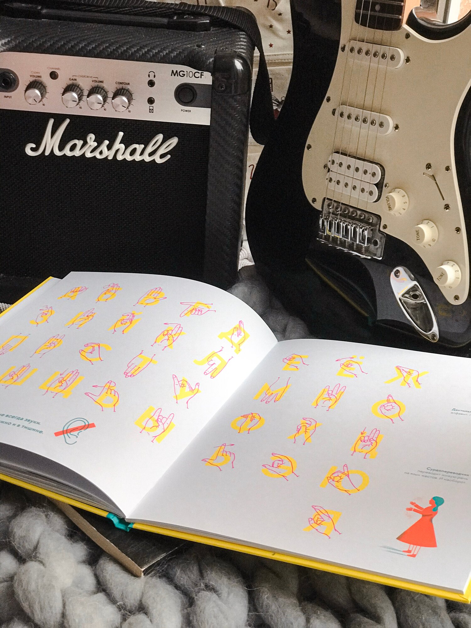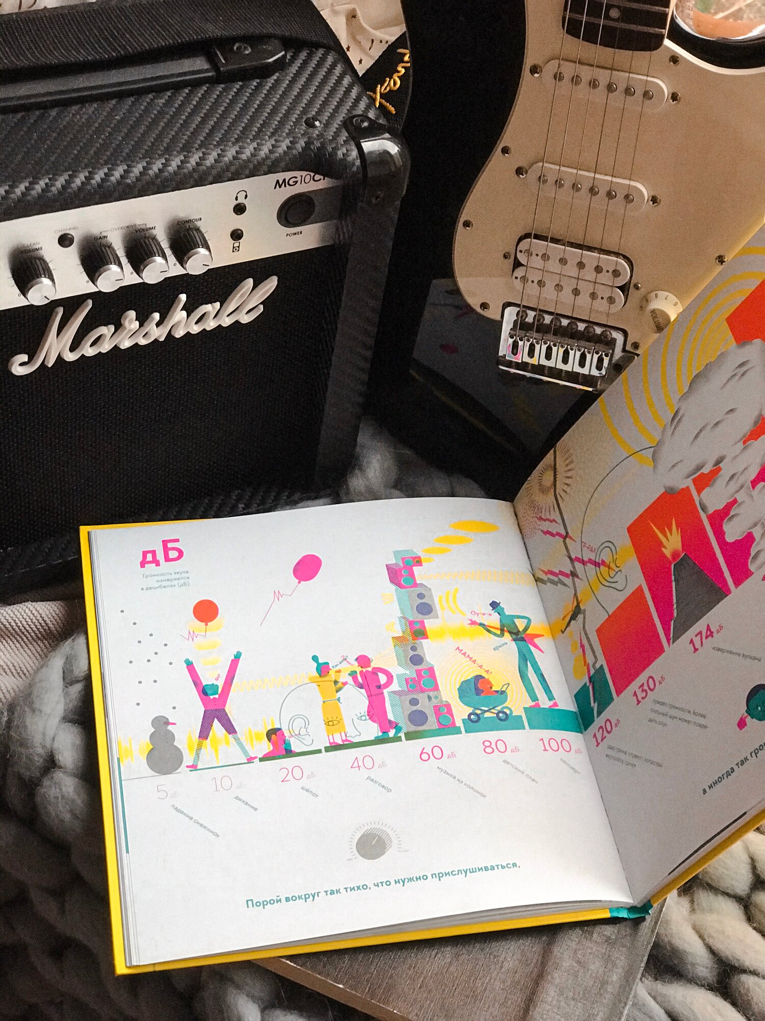 На страницах книги можно не только увидеть дом и человека в разрезе, но и узнать, что может издавать звуки. В книге есть развороты, посвященные звучанию города и природы и сравнению громкости звуков в децибелах. Здесь читатель познакомится с дактильной азбукой, сможет попытать свои силы и расшифровать с её помощью несколько слов. В книге собраны не только яркие иллюстрации сопровождаемые короткими текстами на тему звуков и особенностей слуха, но и "философские" размышления о том, как важно слышать и понимать друг друга, и что иногда нужно отгородиться от шума и побыть в тишине.