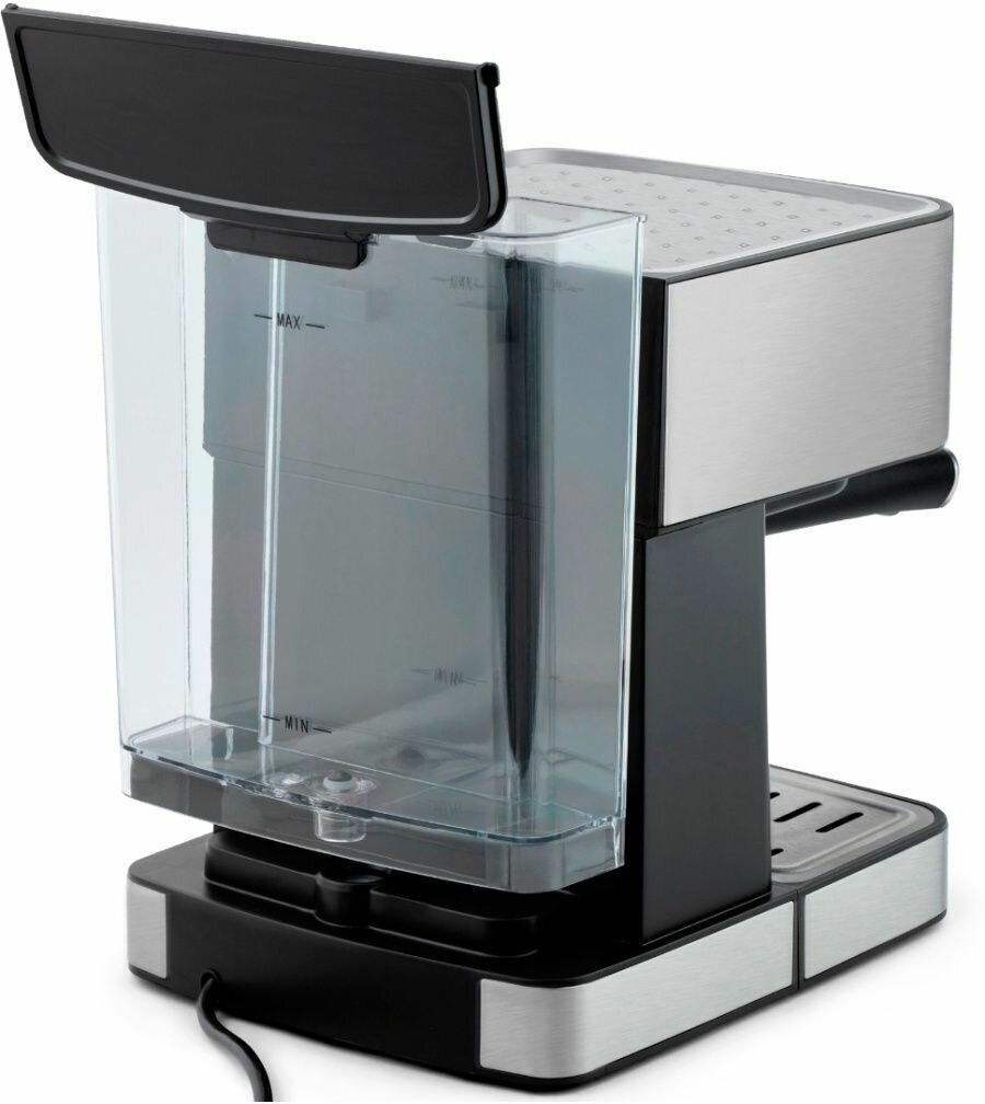 Прибор предназначен для приготовления трех разновидностей напитков: эспрессо, латте и капучино. В качестве системы нагрева используется бойлер, который подогревает нужное количество воды из резервуара до необходимой температуры и подает ее в заварочный отсек. Также предусмотрена функция подогрева чашек. Корпус выполнен из прочного пластика, а рожок и решетка на поддоне для капель – из металла.