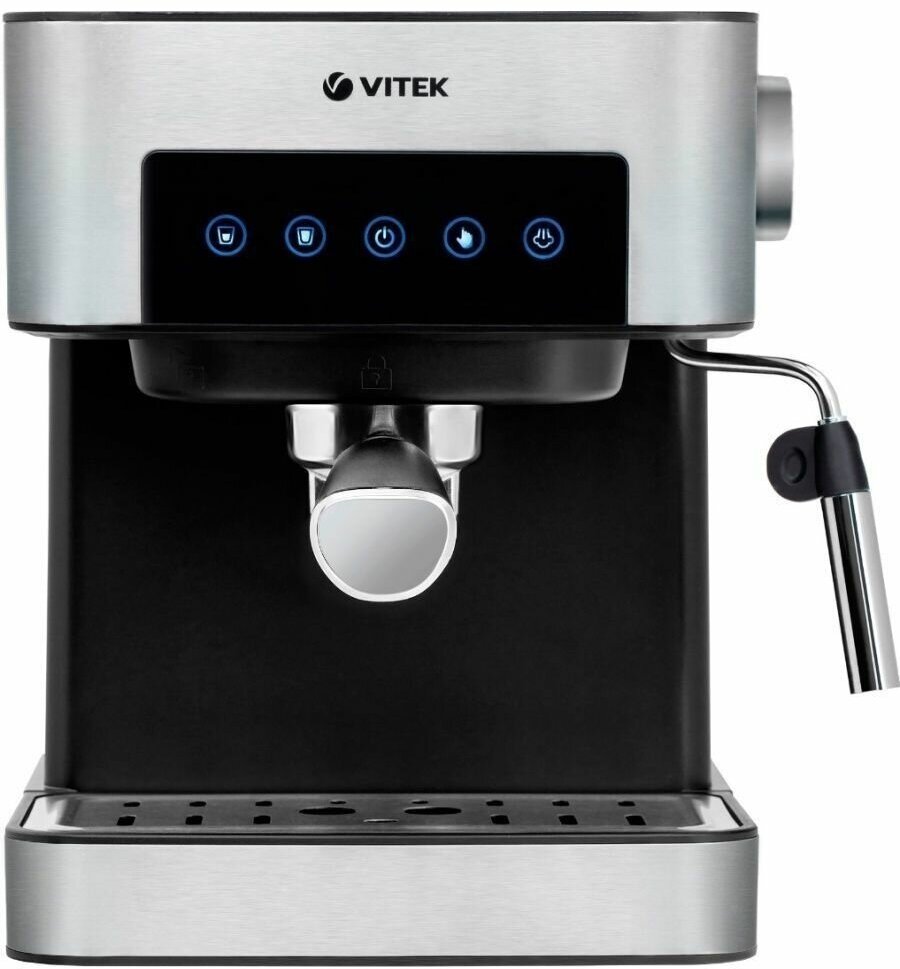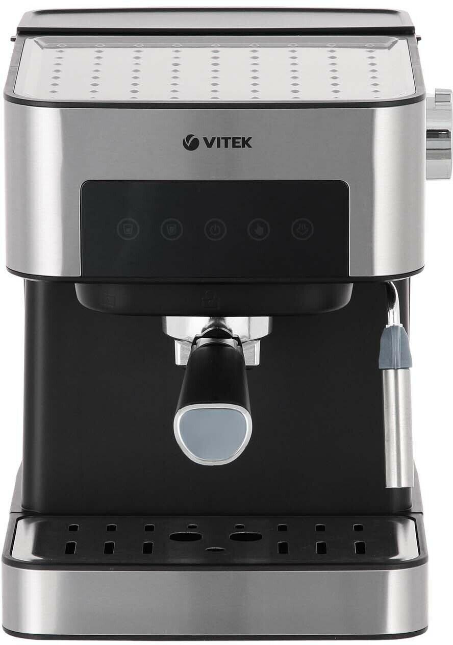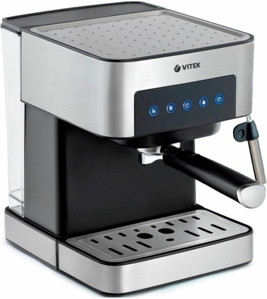 Кофеварка рожкового типа Vitek отличается следующими параметрами: высота составляет 28 см, ширина – 21 см, глубина – 40 см. Прибор можно использовать для варки кофе одновременно на две чашки. Управление устройством механическое, владелец имеет возможность самостоятельно регулировать объем порции. Также кофеварка имеет встроенный капучинатор с ручным типом управления.