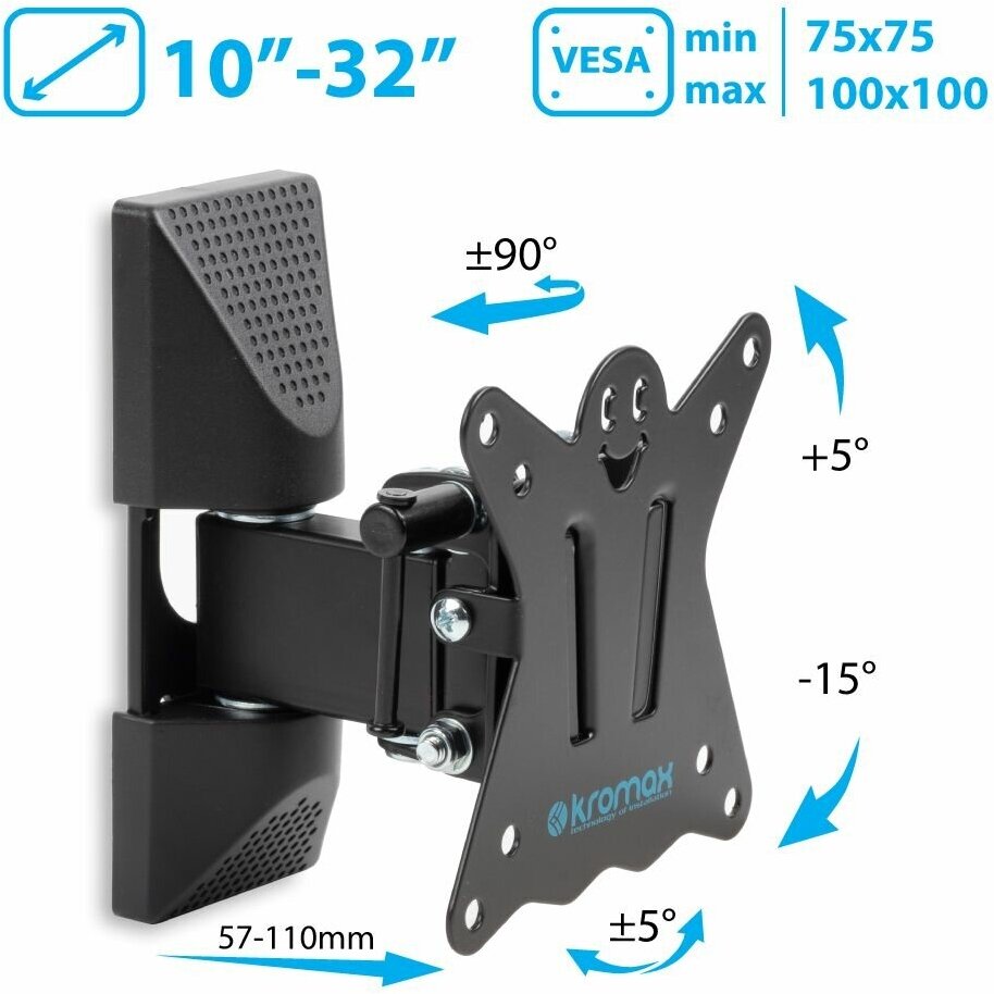 Оригинальный наклонно-поворотный кронштейн идеально подходит для всех LED/LCD телевизоров с диагональю экрана от 10 до 26 дюймов (25-66 см) и весом до 15 кг. Надежная стальная конструкция позволяет легко и плавно наклонять телевизор вверх–вниз под углом +5°-15° относительно стены, а также поворачивать влево–вправо под углом 90°. Расстояние от стены регулируется в пределах от 57 до 110 см. Крепежные отверстия соответствуют стандартам VESA 75×75 мм и 100×100 мм.