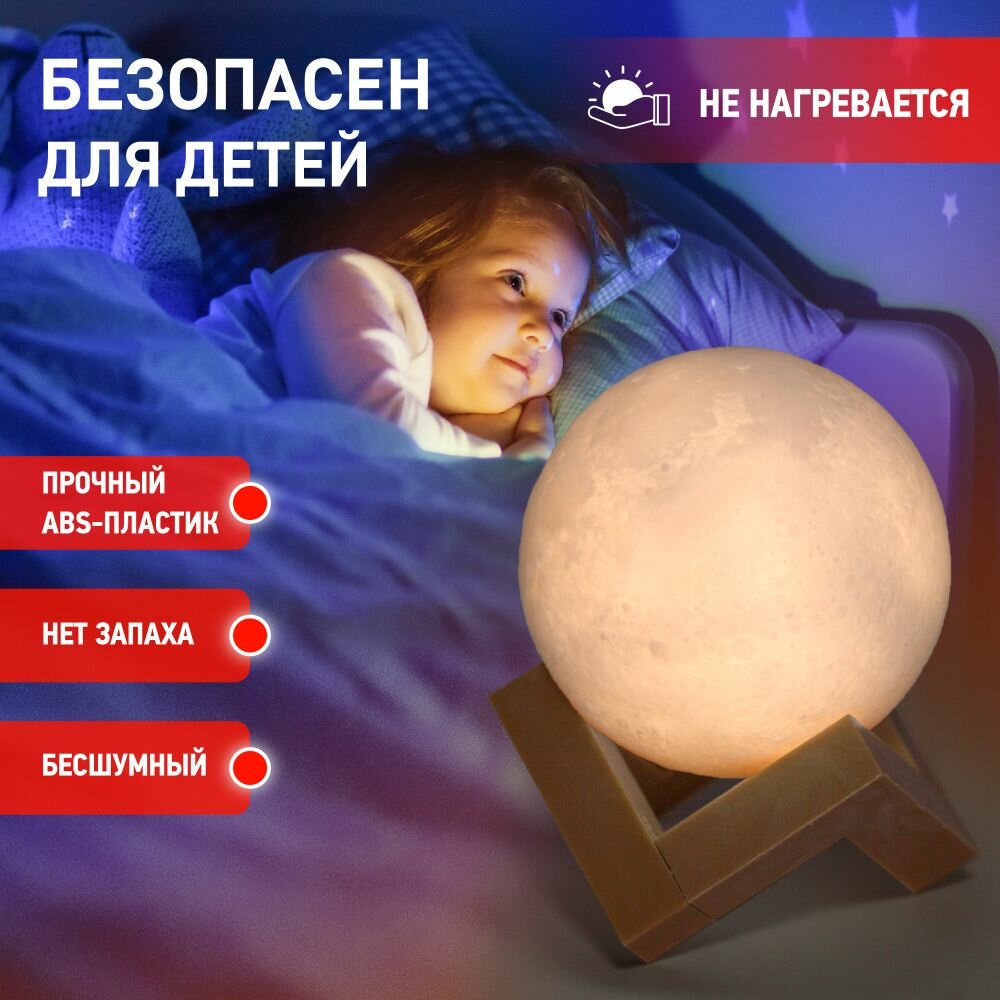 Работает от встроенного литиевого аккумулятора. Подзарядка от USB. USB кабель в комплекте. Сенсорное управление - переключение прикосновением. Два цвета свечения - белый и желтый. Плавная регулировка яркости. Рельеф поверхности шара повторяет рельеф настоящей Луны. Диаметр шара 10 см.