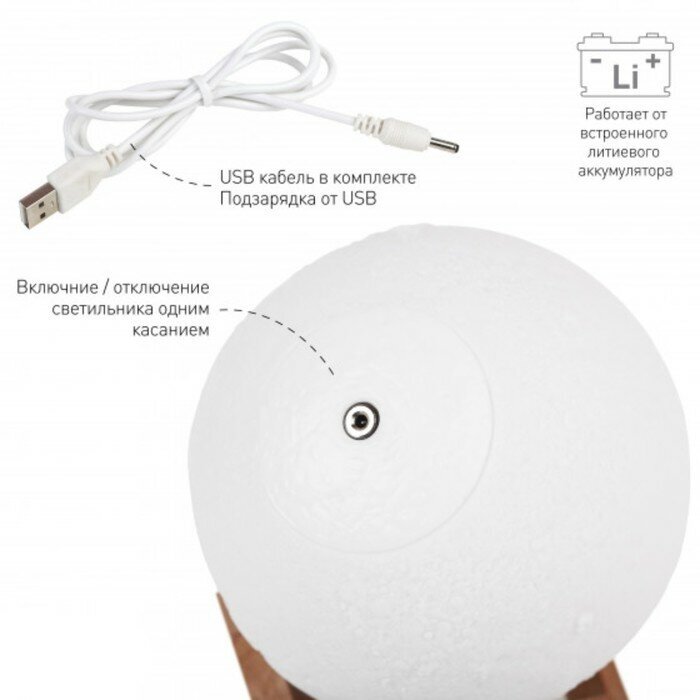 Работает от встроенного литиевого аккумулятора. Подзарядка от USB. USB кабель в комплекте. Сенсорное управление - переключение прикосновением. Два цвета свечения - белый и желтый. Плавная регулировка яркости. Рельеф поверхности шара повторяет рельеф настоящей Луны. Диаметр шара 15 см.