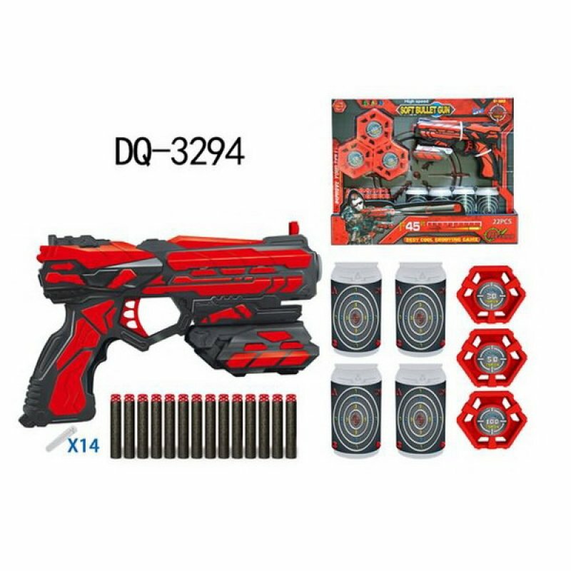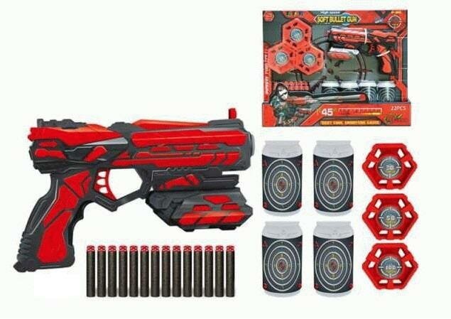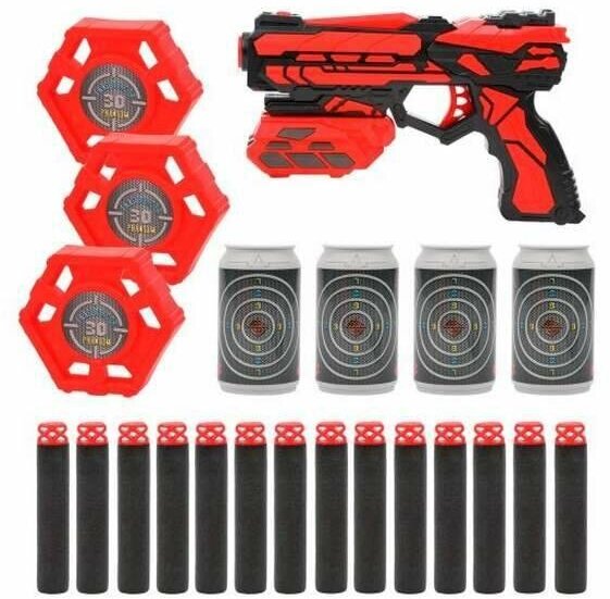 Игрушка поспособствует развитию ловкости, меткости и глазомера. В комплекте прилагаются мягкие поролоновые пули в количестве 14 штук, а также 7 мишеней.