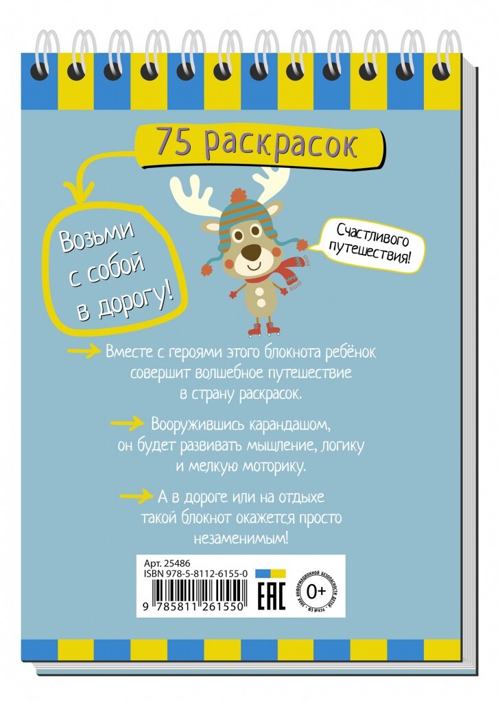 | Описание | Открыв этот блокнот, ребёнок попадёт в волшебную страну раскрасок. Вооружившись карандашами и фломастерами, он будет раскрашивать картинки по образцу, подбирать цвета к предметам, определять закономерности в чередовании цветов. А в дороге или на отдыхе такой блокнот будет просто незаменим. Детям от 5 лет.,Удобный формат для выполнения заданий в дороге или на природе.,+ 75 раскрасок.,+ Ответы к каждому заданию.,+ Разработано специалистами по детскому развитию. |