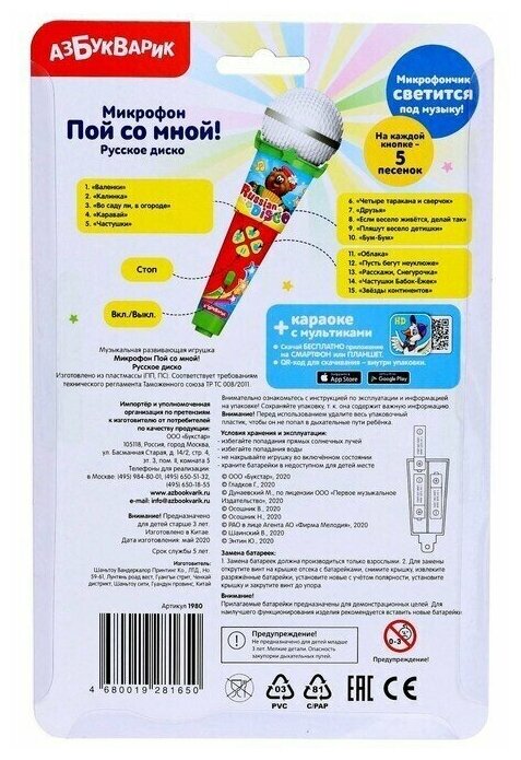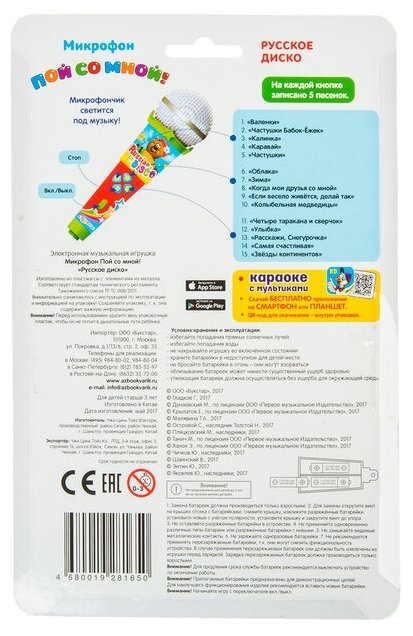 | Описание | Этот удивительный микрофон превратит любой праздник в настоящее шоу! Он светится под музыку, как настоящий диско-шар! Слушай 15 детских хитов ("Частушки Бабок-Ёжек", "Калинка", "Каравай", "Когда мои друзья со мной" и др.), танцуй и подпевай любимым героям. Весёлое пение с микрофоном раскроет музыкальные и актёрские таланты малыша.,,Мобильное приложение от Азбукварика подарит ещё больше веселья! Скачай "Караоке с мультиками" с помощью бонусного QR-кода на упаковке |