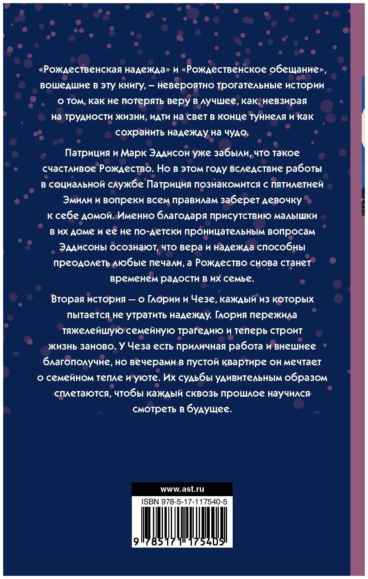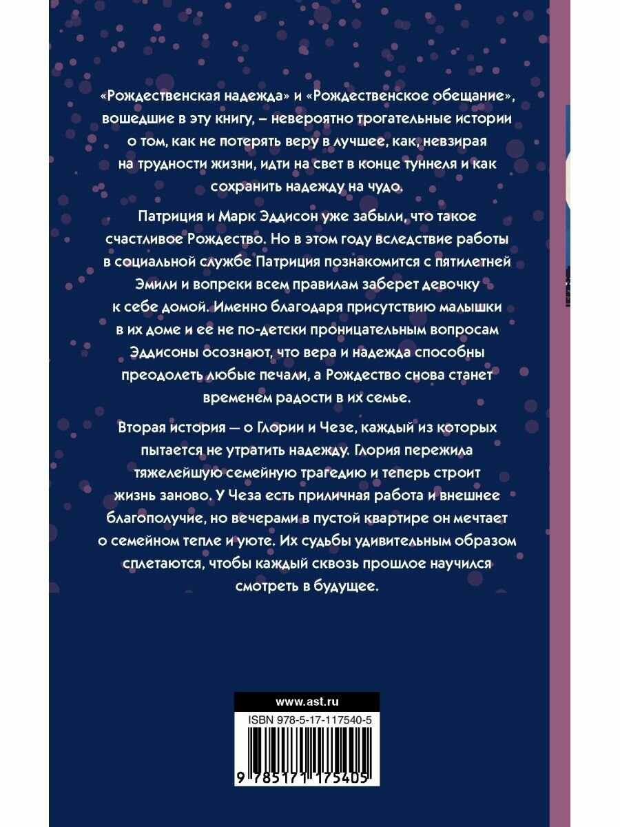 "Рождественская надежда" и "Рождественское обещание", вошедшие в эту книгу, — невероятно трогательные истории о том, как не потерять веру в лучшее, как, невзирая на трудности жизни, идти на свет в конце туннеля и как сохранить надежду на чудо. Патриция и Марк Эддисон уже забыли, что такое счастливое Рождество. Но в этом году вследствие работы в социальной службе Патриция познакомится с пятилетней Эмили и вопреки всем правилам заберет девочку к себе домой. Именно благодаря присутствию малышки в их доме и ее не по-детски проницательным вопросам Эддисоны осознают, что вера и надежда способны преодолеть любые печали, а Рождество снова станет временем радости в их семье. Вторая история — о Глории и Чезе, каждый из которых пытается не утратить надежду. Глория пережила тяжелейшую семейную трагедию и теперь строит жизнь заново. У Чеза есть приличная работа и внешнее благополучие, но вечерами в пустой квартире он мечтает о семейном тепле и уюте. Их судьбы удивительным образом сплетаются, чтобы каждый сквозь прошлое научился смотреть в будущее.