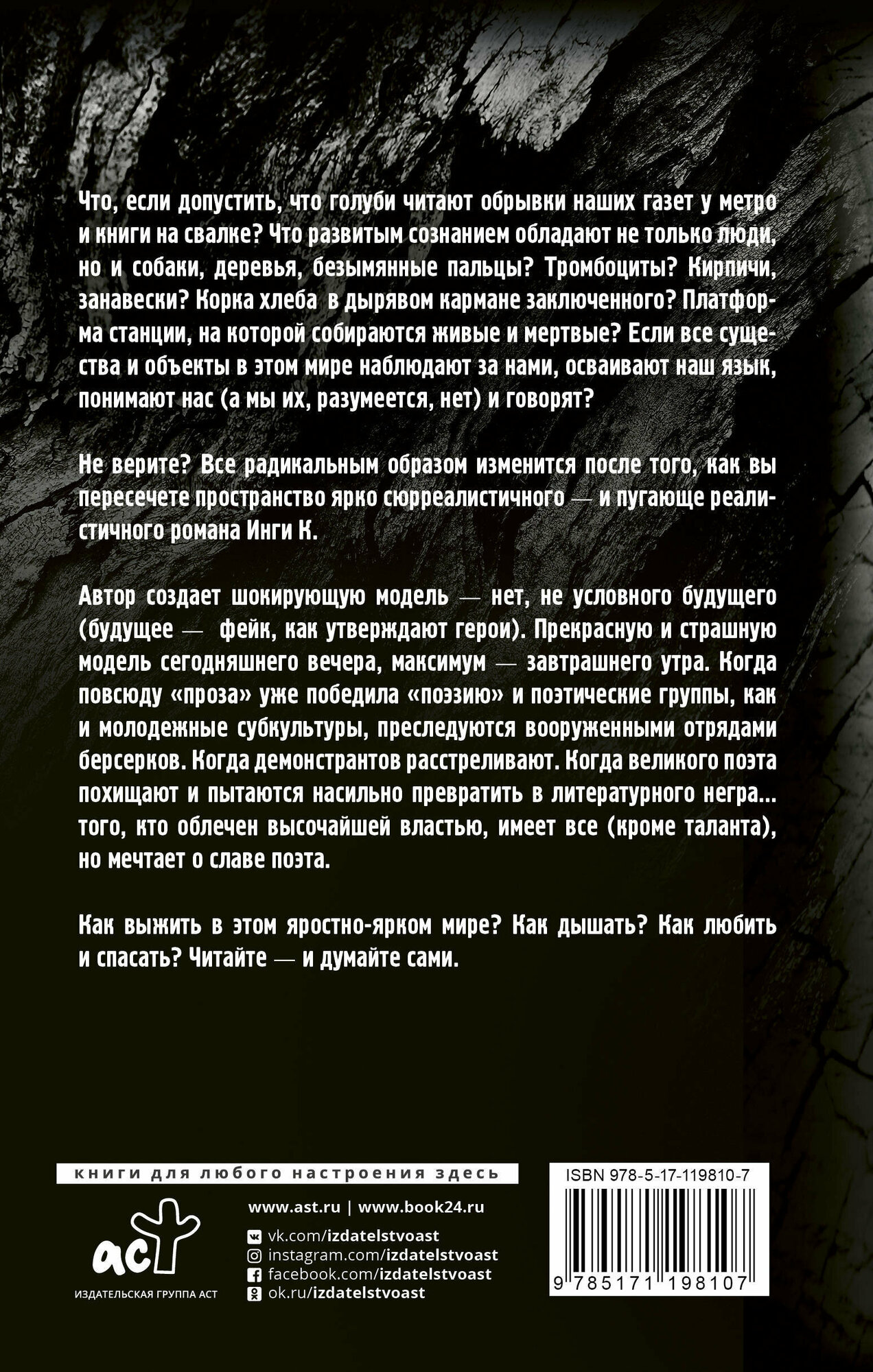 Что, если допустить, что голуби читают обрывки наших газет у метро и книги на свалке? Что развитым сознанием обладают не только люди, но и собаки, деревья, безымянные пальцы? Тромбоциты? Кирпичи, занавески? Корка хлеба в дырявом кармане заключенного? Платформа станции, на которой собираются живые и мертвые? Если все существа и объекты в этом мире наблюдают за нами, осваивают наш язык, понимают нас (а мы их, разумеется, нет) и говорят? Не верите? Все радикальным образом изменится после того, как вы пересечете пространство ярко сюрреалистичного - и пугающе реалистичного романа Инги К. Автор создает шокирующую модель - нет, не условного будущего (будущее - фейк, как утверждают герои). Прекрасную и страшную модель сегодняшнего вечера, максимум - завтрашнего утра. Когда повсюду "проза" уже победила "поэзию", и поэтические группы, как и молодежные субкультуры, преследуются вооруженными отрядами берсерков. Когда демонстрантов расстреливают. Когда великого поэта похищают и пытаются насильно превратить в литературного негра… того, кто облечен высочайшей властью, имеет все (кроме таланта), но мечтает о славе поэта. Как выжить в этом яростно-ярком мире? Как дышать? Как любить и спасать? Читайте - и думайте сами. Инга Кузнецова - поэт и прозаик, переведенный на восемь языков мира, лауреат премий "Триумф" и "Московский счет". Автор пяти поэтических книг и нашумевшего романа "Пэчворк" (2017). "Промежуток" - второй роман автора.