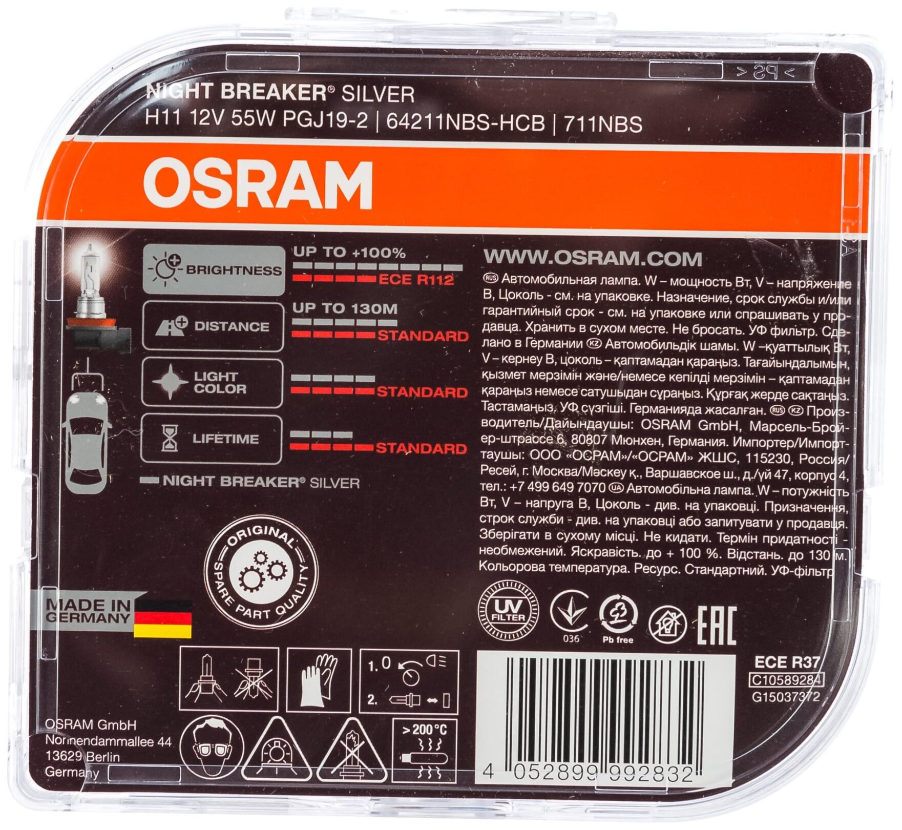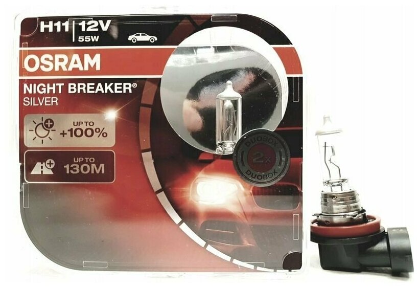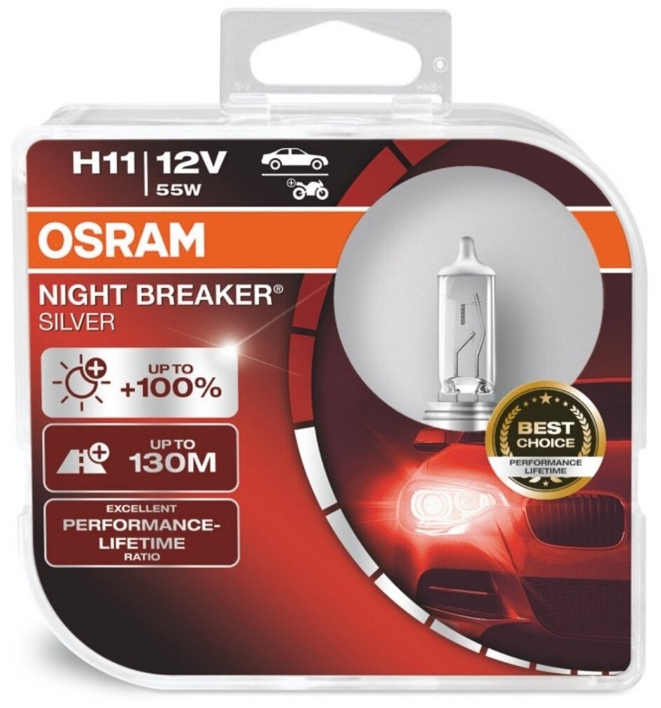 Osram NIGHT BREAKER SILVER - галогенная лампа OSRAM с оптимальным сроком службы. По сравнению с требованиями стандарта, она обеспечивает до 100% больше яркости, образуемый световой луч до 130 м длиннее. Это позволяет распознавать препятствия, опасности и дорожные знаки раньше и реагировать на них быстрее. Кроме того, NIGHT BREAKER SILVER отличаются отличным соотношением цены и качества и современным дизайном с серебристым колпачком (H4/H7/H11). Это идеальный выбор для водителей, придающих наибольшее значение эксплуатационным характеристикам и сроку службы автомобильной лампы.