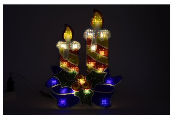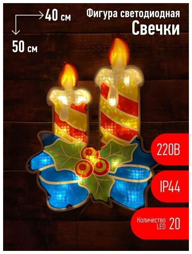 Новогодняя настенная светодиодная фигура ''Эра. Свечки'' для праздничного декора внутри и снаружи помещений. Защищена от влаги и пыли (IP44), отличается морозостойкостью. Работает от стандартной электросети 220 В, прозрачный провод практически не заметен. Светится тёплым белым светом, который создаёт атмосферу уюта. Дизайн фигуры подходит к зимним праздникам. Разноцветные свечки отлично смотрятся и в выключенном, и во включённом состоянии. Размеры: 40х4,5х50 см. В качестве источников света применены 20 ярких и экономичных светодиодов, которые не перегреваются даже при длительной работе без перерывов. Новогодняя LED-фигура - простой и быстрый способ создать праздничное настроение, украсить дом, офис, общественное пространство.