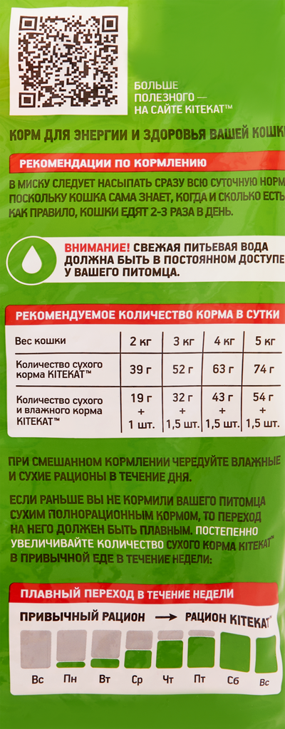 После такого обеда ваш любимец легко сможет покорить любые вершины в доме! А все потому, что Kitekat™ – это полноценная еда, которая содержит все необходимое для вашей кошки. Kitekat™ приготовлен из таких же качественных продуктов, что вы используете дома для своих близких: мясных ингредиентов, овощей, растительного масла и круп. Kitekat™ знает, как их правильно сбалансировать для поддержания энергии и здоровья вашего кота. Состав: злаки и продукты их переработки, мука животного происхождения, продукты животного происхождения, жир животный, белковые растительные экстракты, овощи и продукты их переработки, масло подсолнечное, рыба, минеральные вещества, таурин, холин хлорид, витамины, метионин. Содержание питательных веществ (100 г): белок – 28 г; жир – 10 г; клетчатка – 5 г; зола – 9 г; кальций – 1,5 г; фосфор – 0,9 г; витамин А – 1200 МЕ; витамин Д – 120 ME; витамин Е – 5,5 мг.