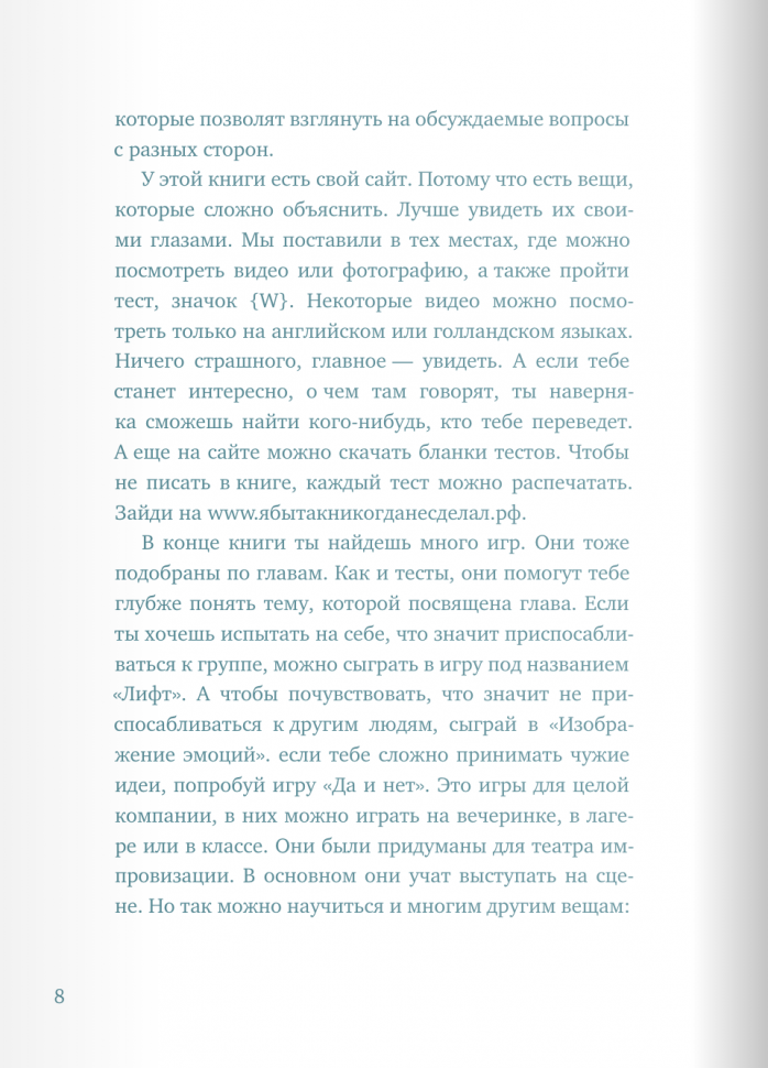 Книга для подростков, но купила для себя. В нашем детстве таких книг не было. Возможно именно по этому тема «Познай себя» до сих пор остаётся интересной. Книга для самоопределения, для осознания себя отдельной и очень ценной личностью. Книга показывает насколько мы все разные. Учит видеть взгляды на вещи других, и уважать чужое мнение. Учит Смотреть и слушать более внимательно. Дает осознание, что первое впечатление Лего может быть ошибочным. Что мнение и взгляды могут меняться . И это нормально.