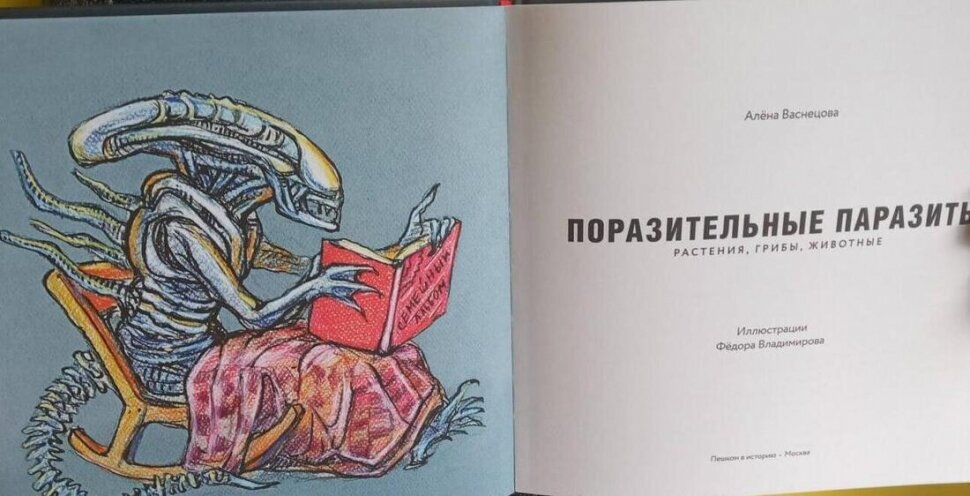 Новая книга Алёны Васнецовой и Фёдора Владимирова «Поразительные паразиты: растения, грибы, животные» с юмором описывает особенности строения и жизни более чем 40 видов паразитирующих созданий. Здесь есть находящиеся на слуху вши и блохи, клещи и клопы, мухи цеце и оводы, слепни и осы-блестянки, удильщики и пиявки, аскариды и ленточные черви. И менее известные (но не менее паразитные) анофелесы, гидноры, кордицепсы, миноги, нуитсии, омелы, острицы, помпилиды, саккулины, филярии, шистосомы — в общем, все те, кто на протяжении нескольких миллионов лет соседствует с обычными животными, а порой и живет внутри них (в том числе и в человеке).