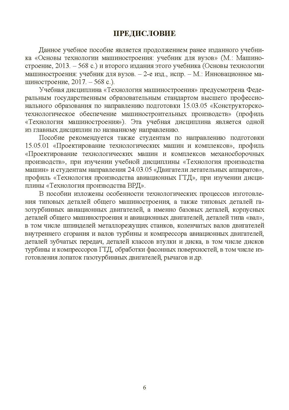 Изложены сведения о технологии изготовления типовых деталей общего машиностроения, в том числе деталей для авиадвигателестроения: базовых и корпусных деталей, валов, деталей зубчатых передач, деталей с фасонными поверхностями, втулок, дисков, рычагов и др.