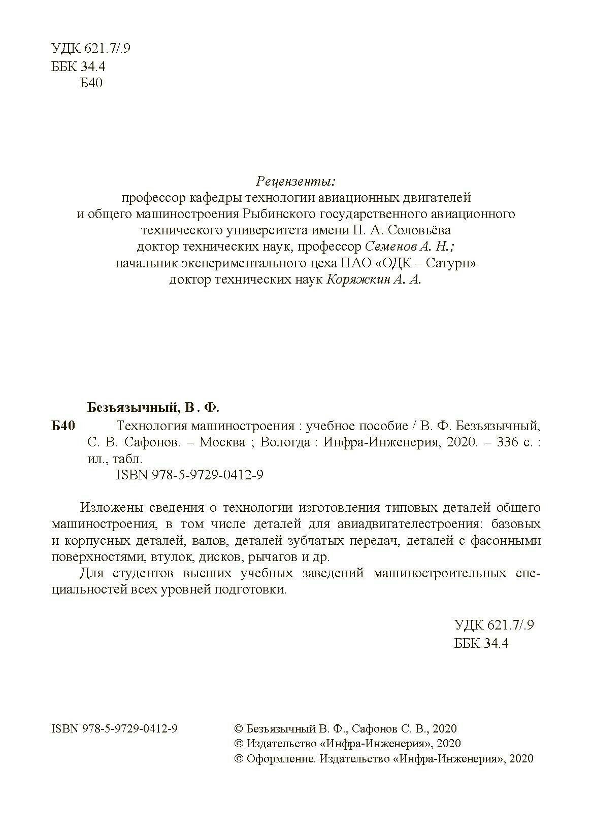 Технология машиностроения. Учебное пособие (Безъязычный Вячеслав Феоктистович, Сафонов Сергей Владимирович); Инфра-Инженерия, 2020