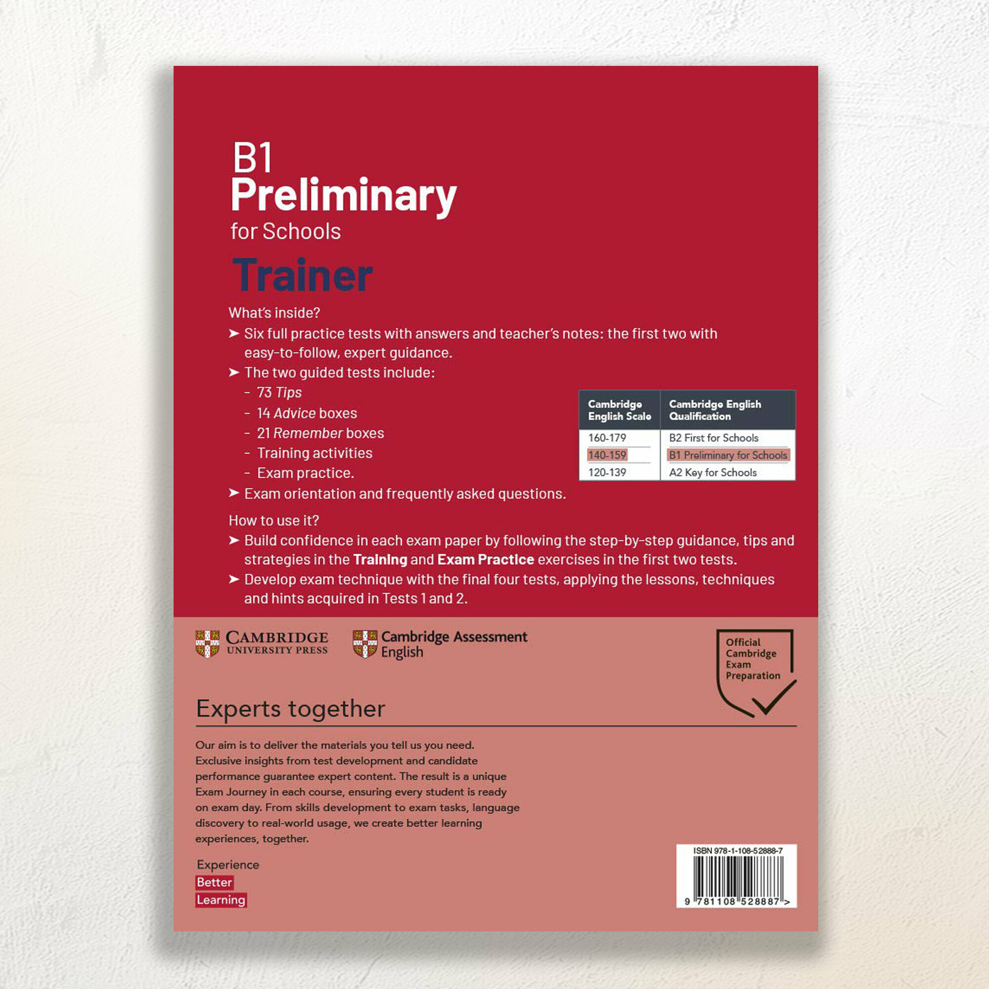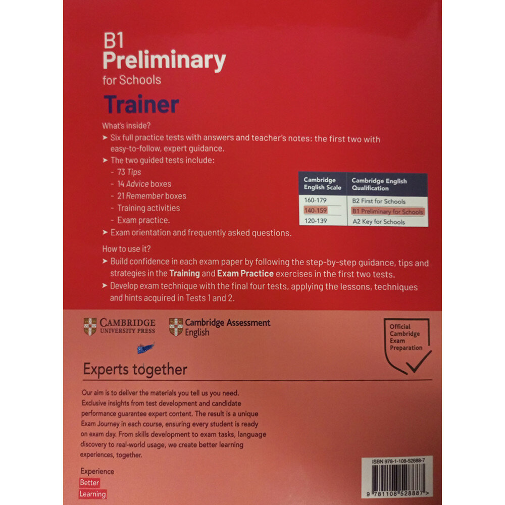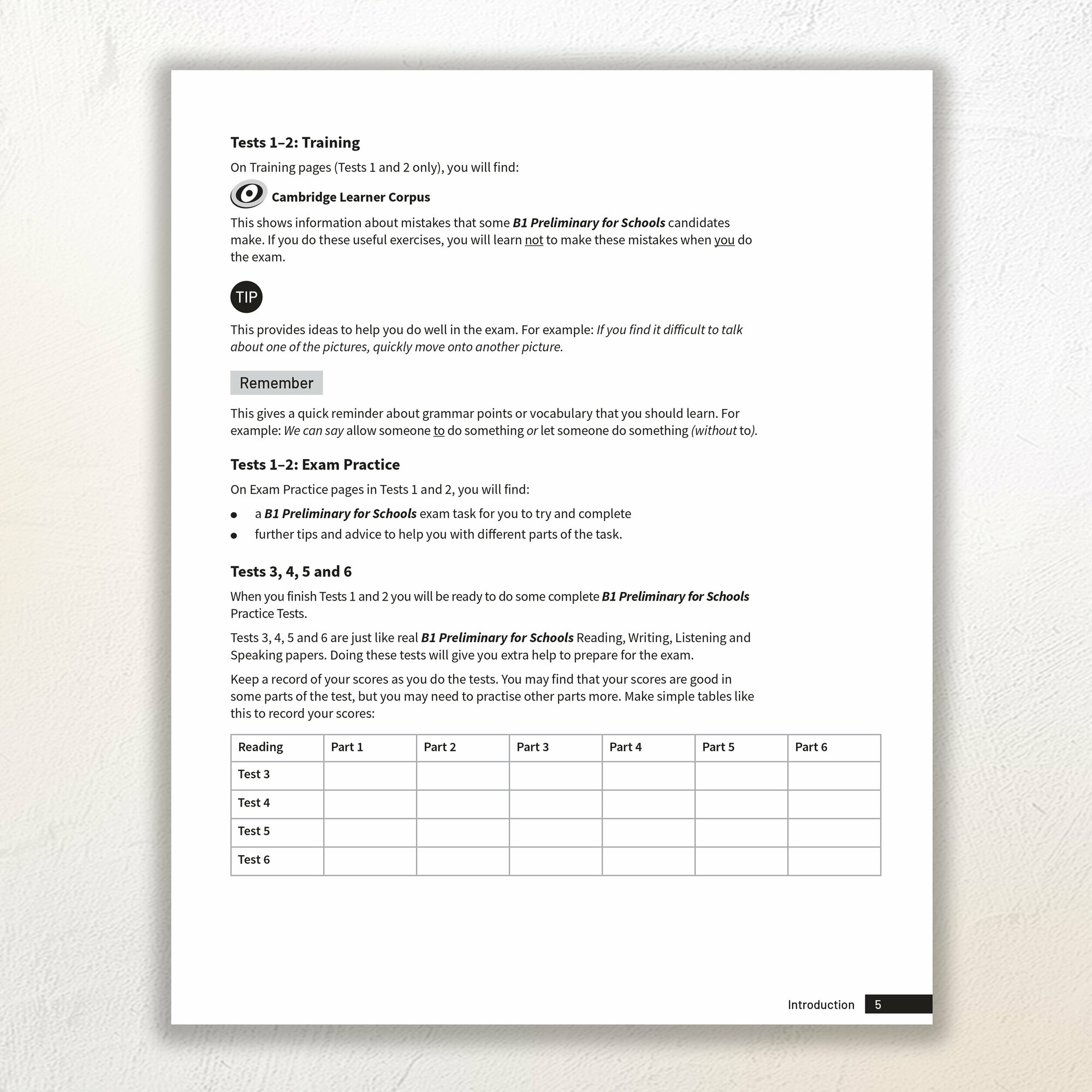 B1 Preliminary for Schools Trainer includes six full practice tests, the first two with easy-to-follow, expert guidance. The two guided tests include: 42 Tips, 24 Advice boxes, 12 Remember boxes, Training activities, Exam practice, Exam orientation and frequently asked questions. Build confidence in each exam paper by following the step-by-step guidance, tips and strategies in the Training and Exam Practice exercises in the first two tests. Develop exam technique with the final four tests, applying the lessons, techniques and hints acquired in Tests 1 and 2.