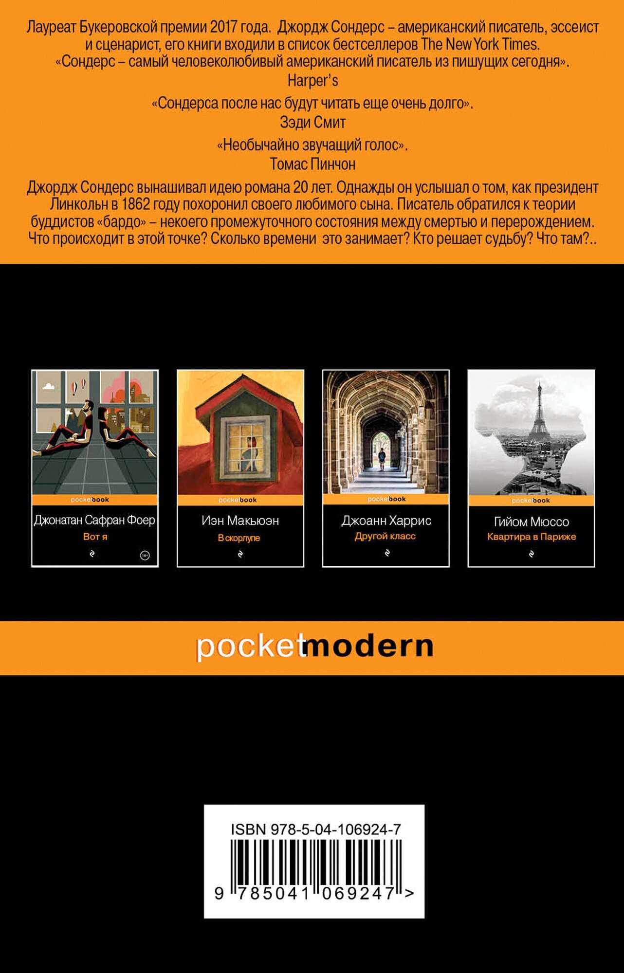 Слегка отдающий готикой и мрачный роман. Мальчик Линкольн после смерти попадает в затхлое болезненное место - Бардо, где много персонажей, которые по той или иной причине не двигаются дальше. В романе Сондерс использует как реальные исторические свидетельства, так и выдуманные, которые вставляет между рассказами призраков и отчаяньем человека, потерявшего сына. Одной из основной мыслей романа является принятие смерти, иначе у живых не получится жить дальше, а у мёртвых умереть. И рядом с этой темой автор поднимает вопросы религии, культуры, истрии, расизма и личности.
