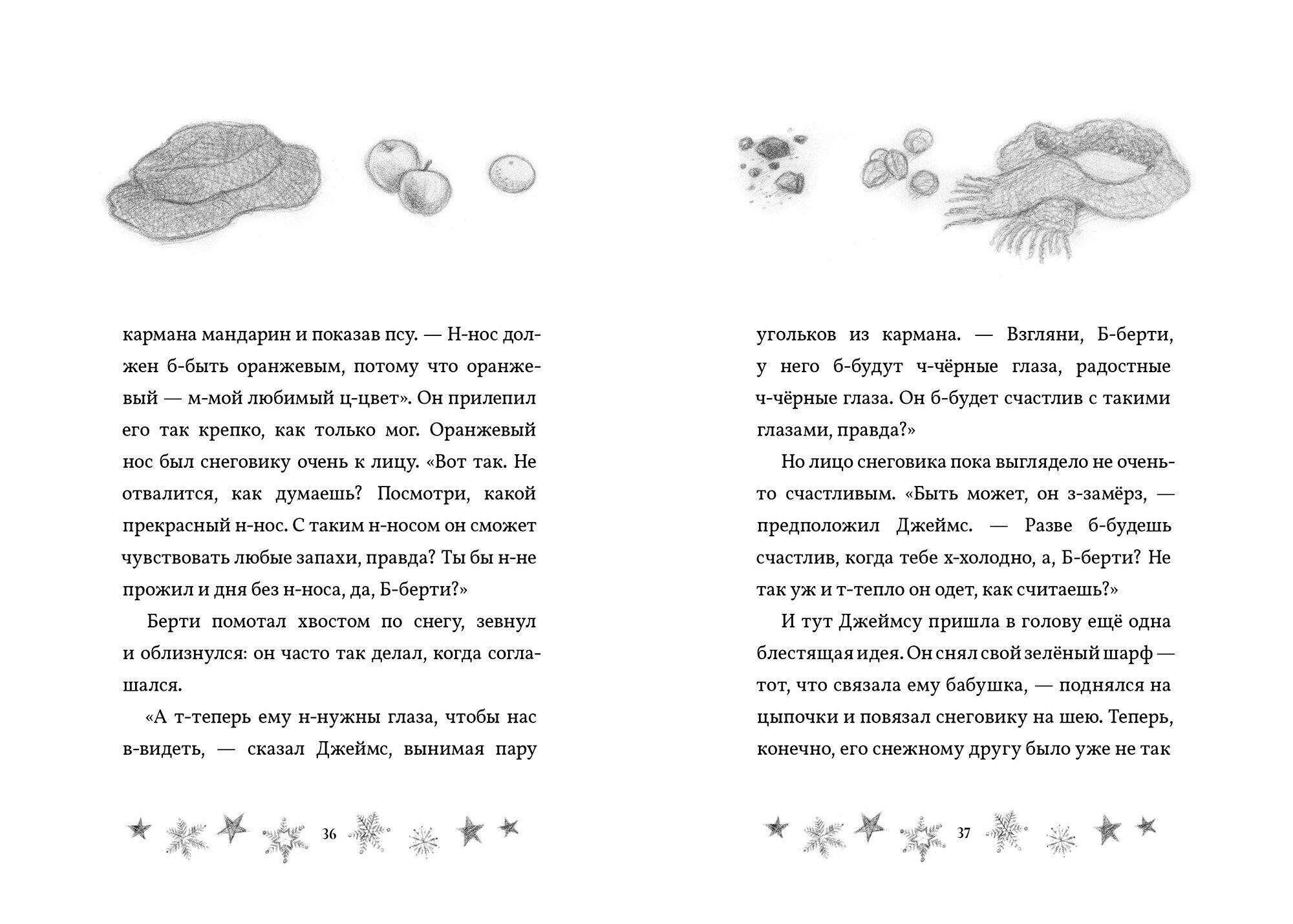 Однажды в конце декабря Джеймс проснулся и увидел, что выпал долгожданный снег. Он поспешил на улицу, чтобы слепить снеговика. Глаза-угольки, старая шляпа, зелёный шарф и мандариновый нос — снеговик получился замечательный! Джеймс так не хотел с ним расставаться, что вышел его навестить прямо посреди ночи. Невероятно, но снеговик ожил...
