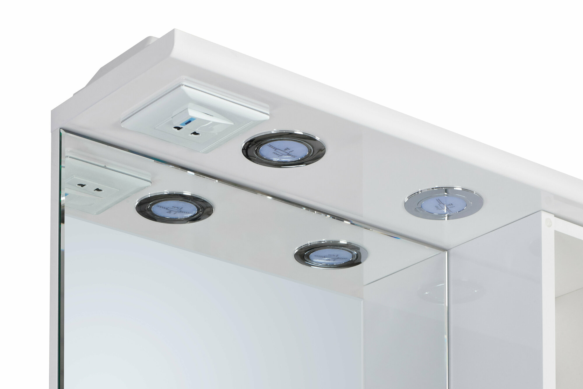 Шкаф выполнен из МДФ и ДСП, окрашен белой влагостойкой эмалью, оснащен двумя галогеновыми лампами с отдельным выключателем.