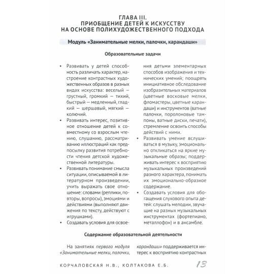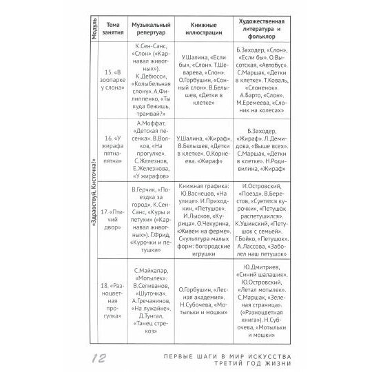 В книге раскрыта система приобщения к искусству детей третьего года жизни. Предложен вариант проектирования образовательной области "Художественно-эстетическое развитие" на основе интеграции музыки, литературы, фольклора, книжной графики, детского театра. Описана система образовательной работы в первой младшей группе (18 сценариев интегрированных занятий). Даны конкретные методические рекомендации. Приведен репертуар художественных произведений. Книга рекомендуется воспитателям групп раннего возраста, специалистам консультационно-методических центров, студентам педагогических колледжей и вузов, сертифицированным няням и родителям, заинтересованным в творческом развитии ребенка с первых лет жизни. Обо всём этом и не только в книге Первые шаги в мир искусства интегрированные занятия. Третий год жизни. ФГОС до (Наталья Валентиновна Корчаловская, Елена Борисовна Колтакова)