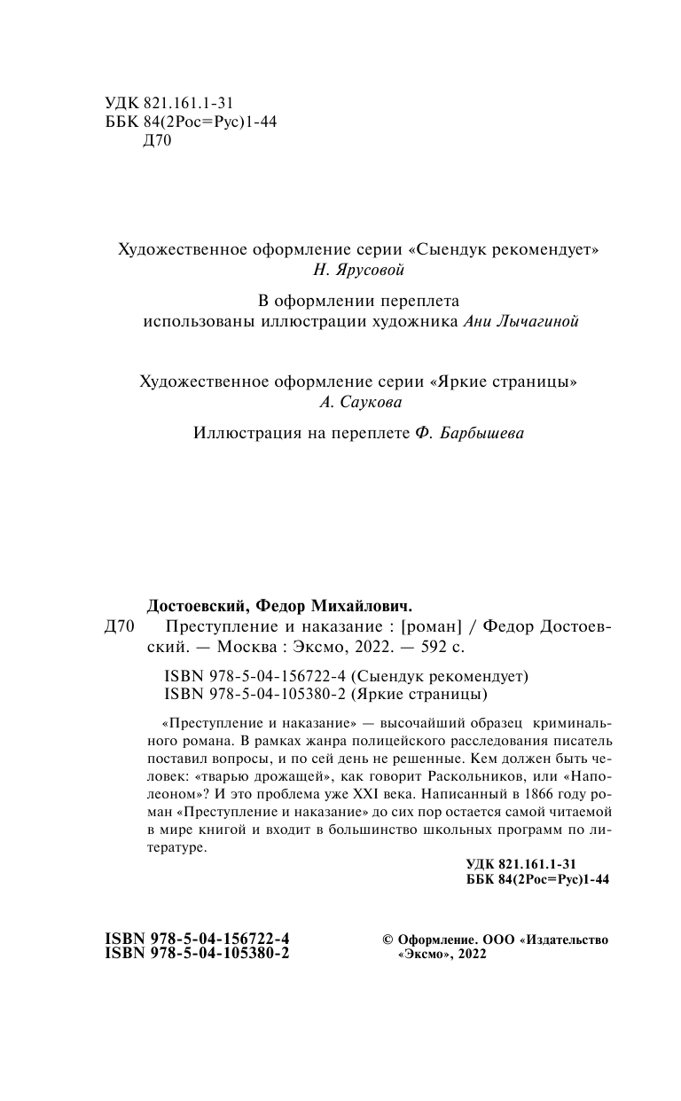 "Преступление и наказание" - это просто уникальный детектив. С первых минут от нас не скрывают ни имени преступника, ни имени жертвы, ни самого деяния. Убийство - лишь повод, ведь всё самое интересное начинается после. Книга замечательная, удобная, страницы белые плотные. Уже выкупила многие книги из этой серии для коллекции.