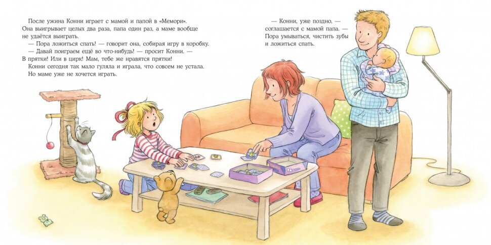 Вы уже прочитали книгу? Тогда закройте ее и предложите малышу вспомнить, о чем была эта история. Как думаешь, почему Конни никак не могла уснуть? Как мама с папой старались ей помочь?