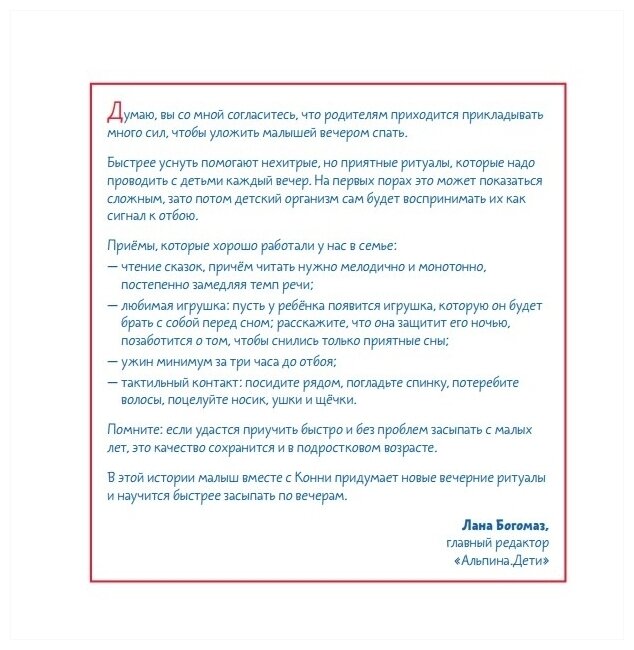 Родителям часто приходится прикладывать много сил, чтобы уложить малышей спать. Ребенок перегулял или ему скучно лежать в кровати, а может быть, снова почудился подкроватный монстр? Вот и Конни не спится. Как же уложить маленькую непоседу? Прочитайте эту историю на ночь, чтобы помочь ребенку успокоиться и без капризов уснуть.