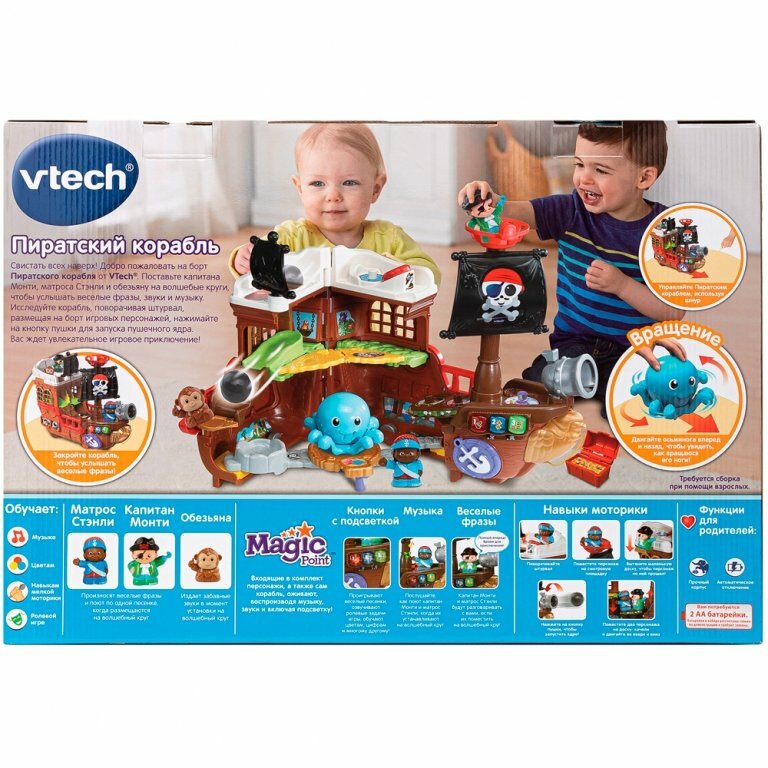 Новинка от Vtech содержит 3 персонажа для игры - капитана, матроса и обезьянку. Также в комплект входят сундук, пушечное ядро и осьминог. Предусмотрено три увлекательных игровых режима - обучение, ролевая игра, музыкальный режим. Ребенок может играть как самостоятельно, так и в компании с родителями или друзьями.