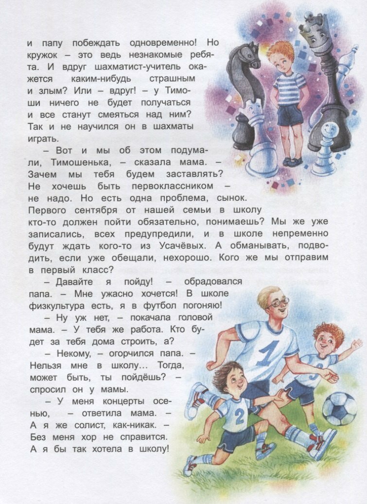 Пока Тимофей опасается будущих перемен и размышляет, будет ли ему страшно в школе, маленькие читатели и их родители смогут познакомиться с его учительницей, побывать на экскурсии по школе, получить в подарок новенькое расписание занятий и выяснить, наконец, кто же из семьи Усачёвых отправится на учёбу первого сентября!