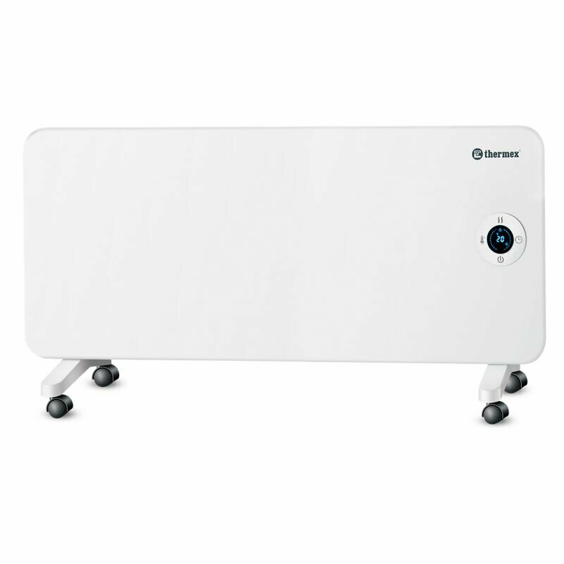 Thermex (Термекс) классический электрообогреватель, оборудованный монолитным нагревателем из алюминия. Модель устанавливается на пол на специальные ножки, либо на стену при помощи креплений, идущих в комплекте с устройством. Установка параметров работы осуществляется с пульта ДУ, на корпусе прибора имеется дисплей, отображающий температуру.