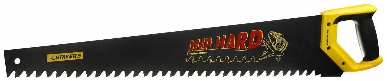 | Прочие особенности и свойства | Ножовка STAYER DEEP HARD 2-15097 - инструмент для ручной распилки блоков из пенобетона. Рукоятка выполнена из пластика и резины, что не позволяет ей проскальзывать в руке и обеспечивает жесткий хват.,Шаг зубьев 20 мм;,Длина полотна 700 мм.,Зубья С твердоплавной вставкой |