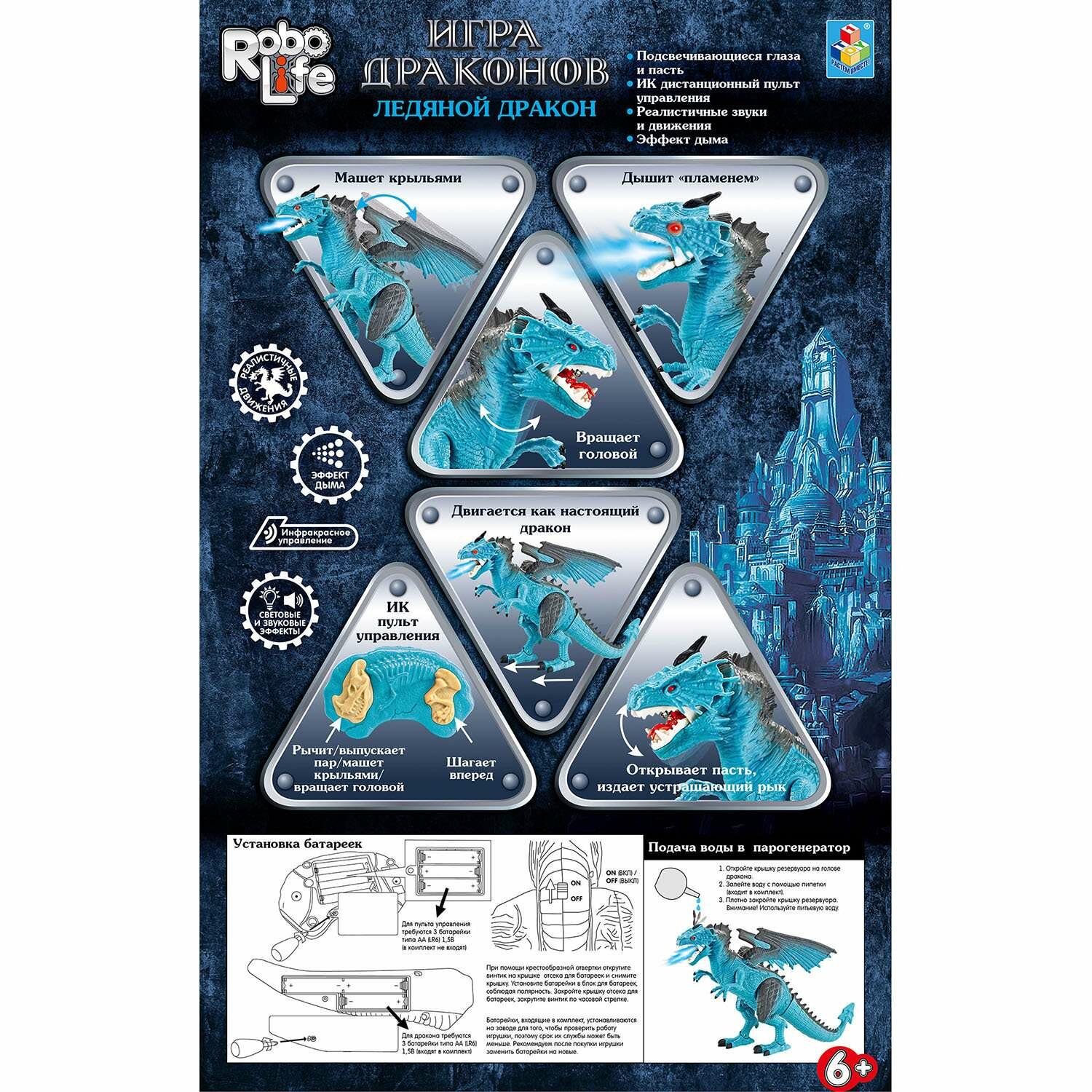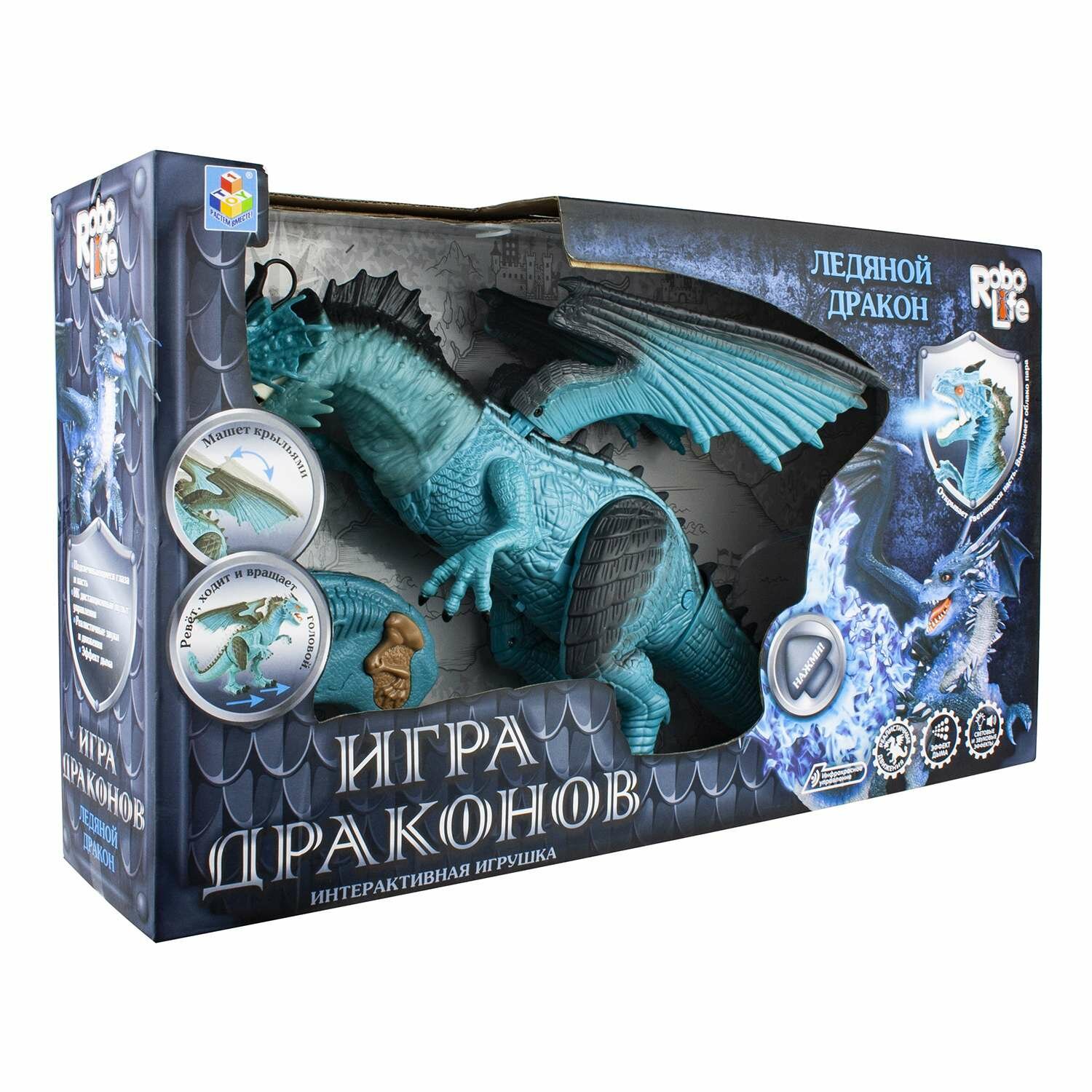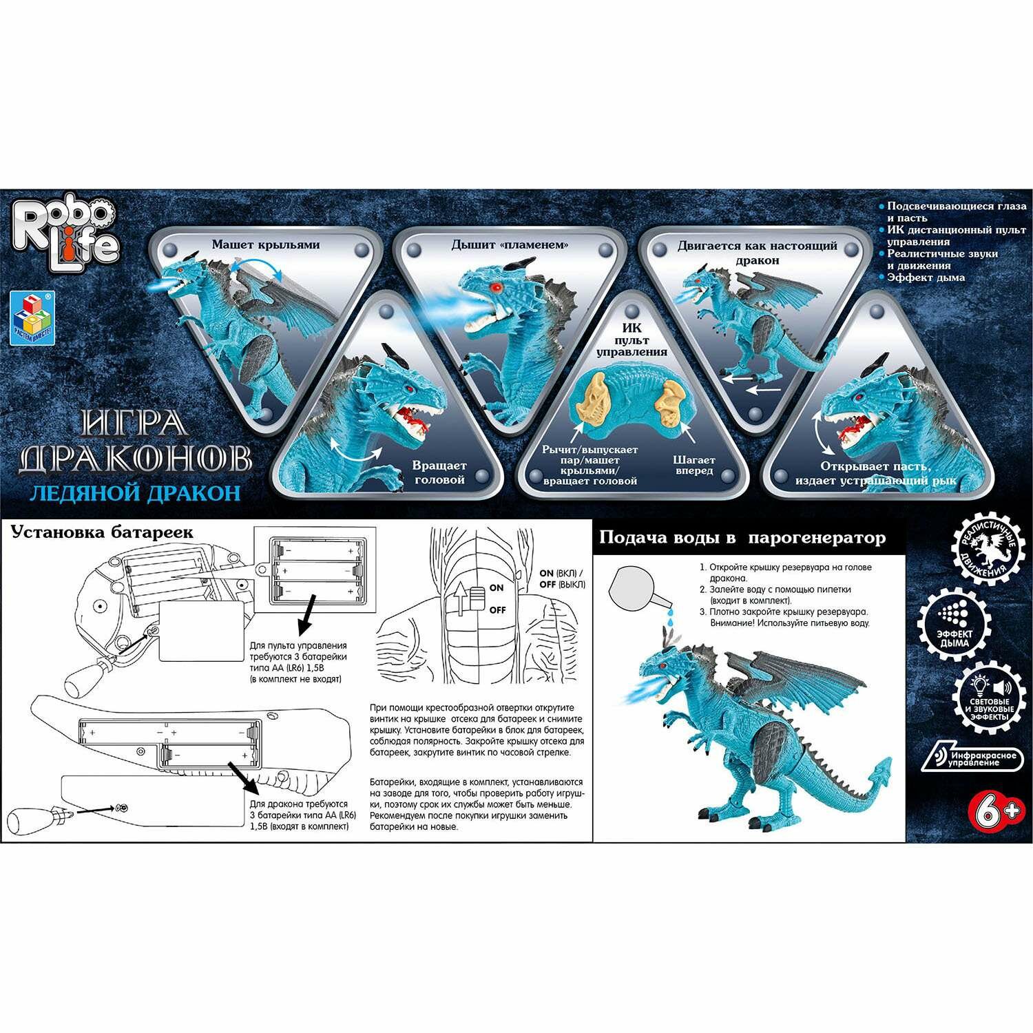 Интерактивный Ледяной дракон Robo Life голубого цвета с черными элементами на спине, крыльях и лапах. У него реалистичная кожа, подвижные голова, пасть, крылья и лапы. Умеет двигаться вперед, менять положение лап, махать крыльями и открывать пасть. Во время движения издает хищный рев и выпускает из пасти ледяной пар.