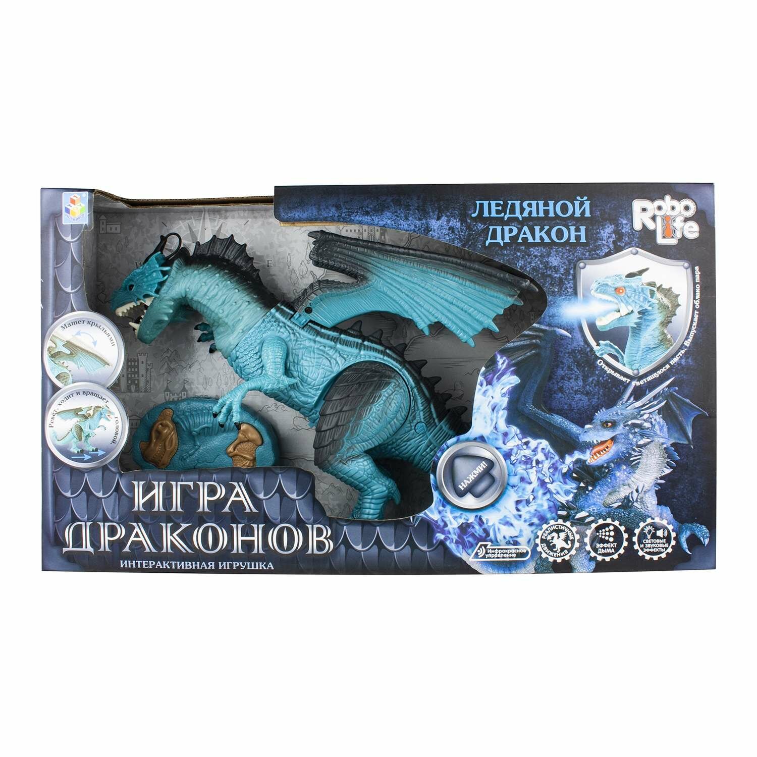 Интерактивная игрушка 1toy T16703 Ледяной Дракон на ИК управлении (звук, свет, движение, парогенератор), голубой