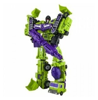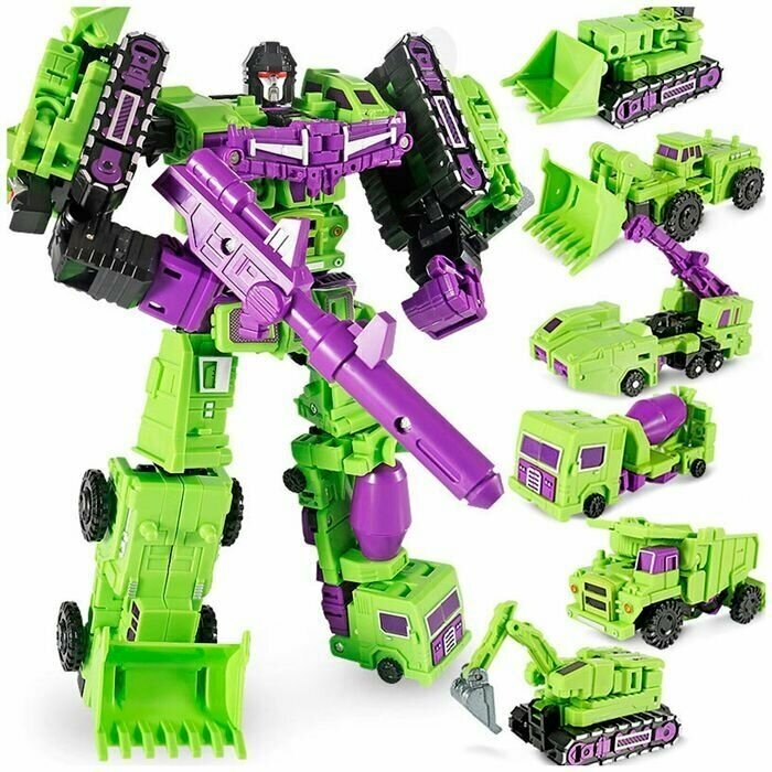 Игрушка выполнена из деталей салатового, фиолетового и черного цвета, имеет много подвижных деталей. В ассортименте роботы: Кранер, Эксдиггер, Дозербот, Фронтлифтер, Дампербот и Миксербот. Размер игрушки 9 см.