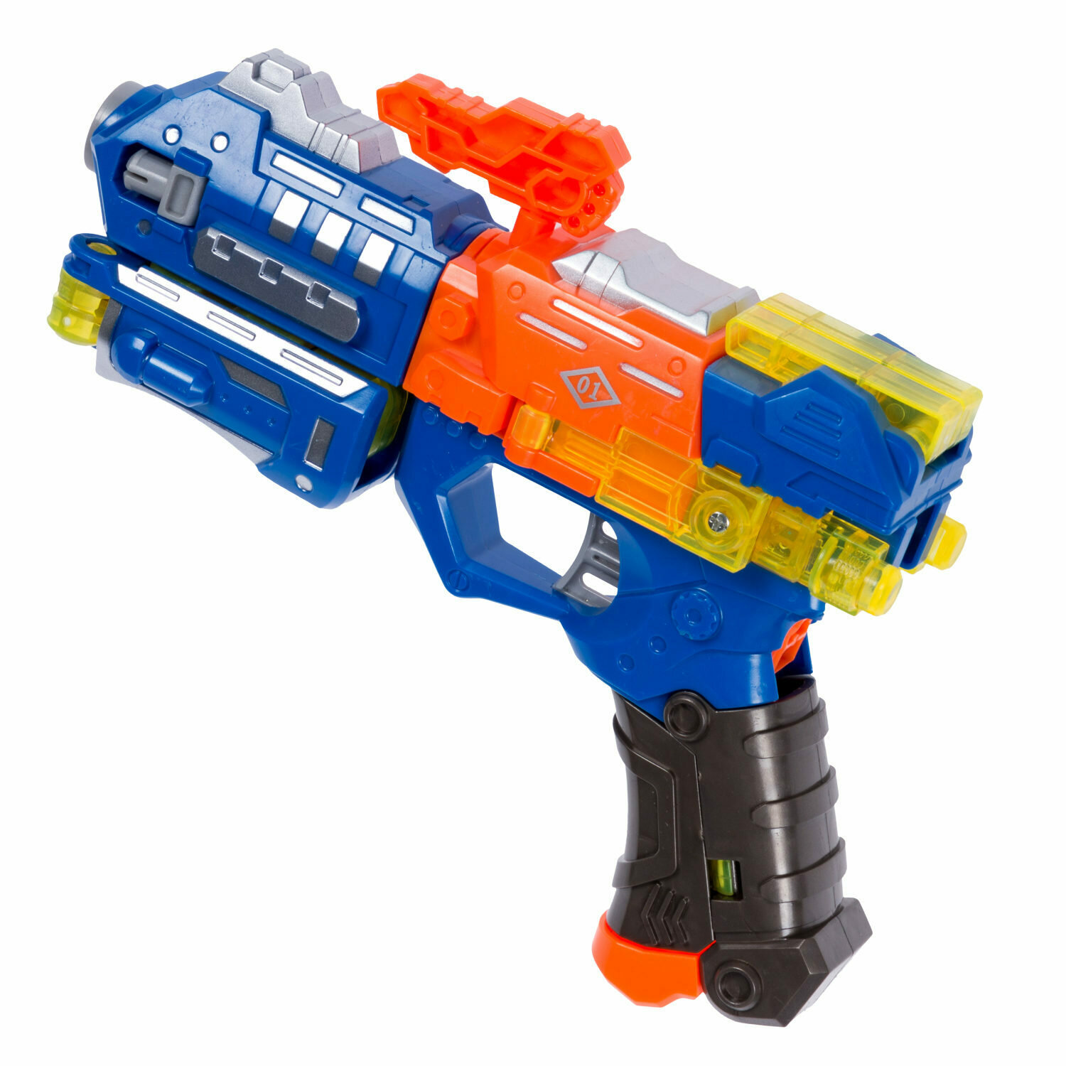 Бластер состоит из разноцветных пластиковых деталей. В собранном виде размер 17х13х4,5 см. Дальность поражения до 8 метров. Заряжается патронами с мягкими наконечниками. Размер патрона 6х1,2х1,2 см. Оружие действует бесшумно и быстро.