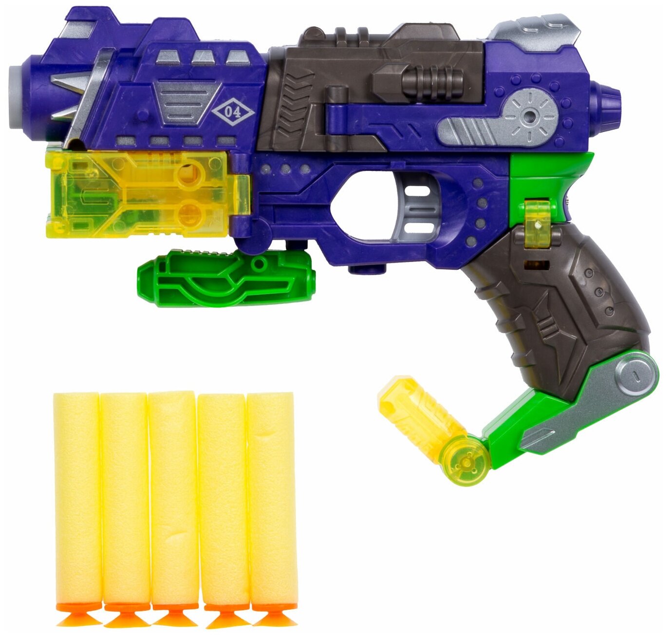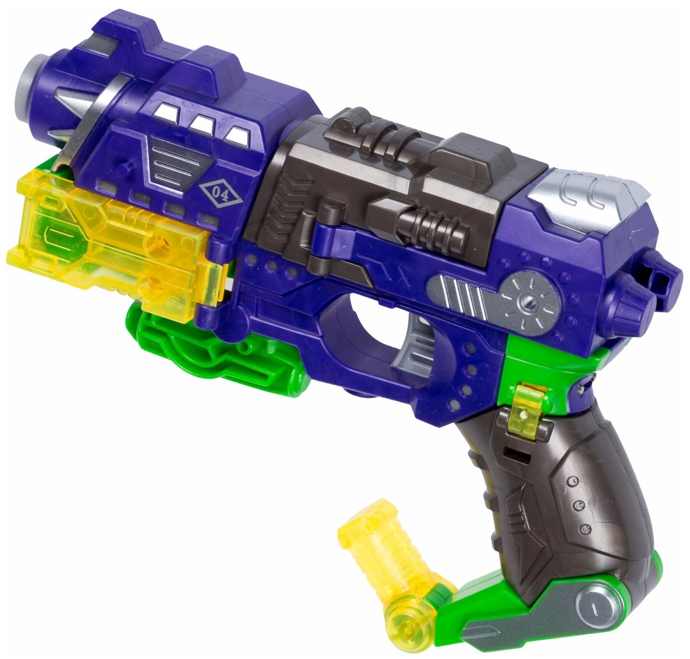 Бластер состоит из разноцветных пластиковых деталей. В собранном виде размер 17х13х4,5 см. Дальность поражения до 8 метров. Заряжается патронами с мягкими наконечниками. Размер патрона 6х1,2х1,2 см. Оружие действует бесшумно и быстро.