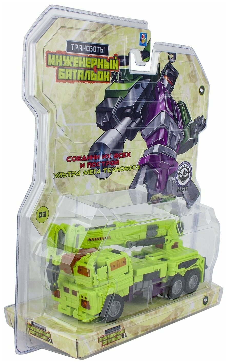 Робот-трансформер, который быстро превращается в грузовик с краном и является частью туловища большого робота Мега Технобота высотой 42 см. Мега Технобот собирается из 6 роботов-трансформеров.