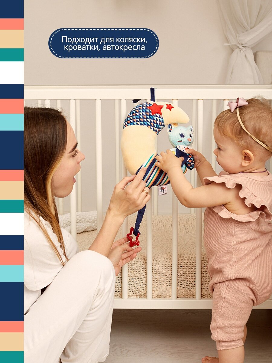 Механический мобиль «Ночь Волшебства» проигрывает приятную колыбельную мелодию. К месяцу крепится отдельная игрушка-погремушка «Котик Дарси».